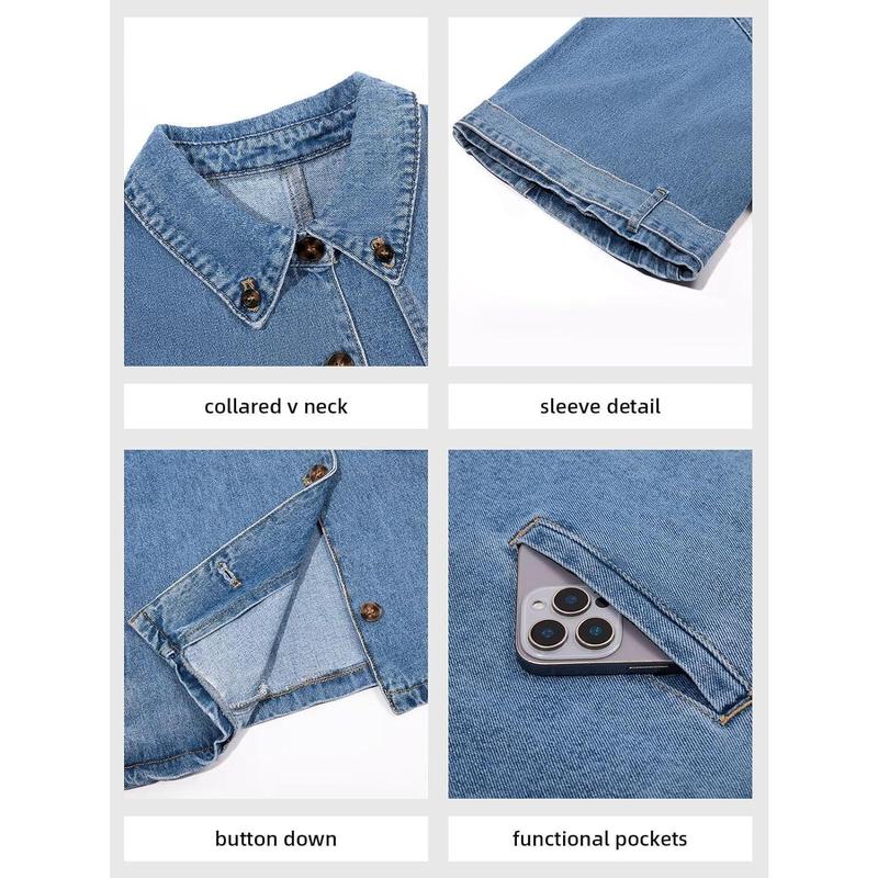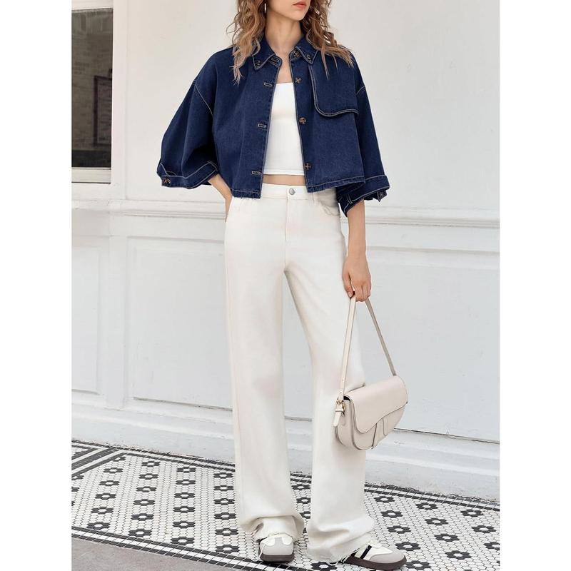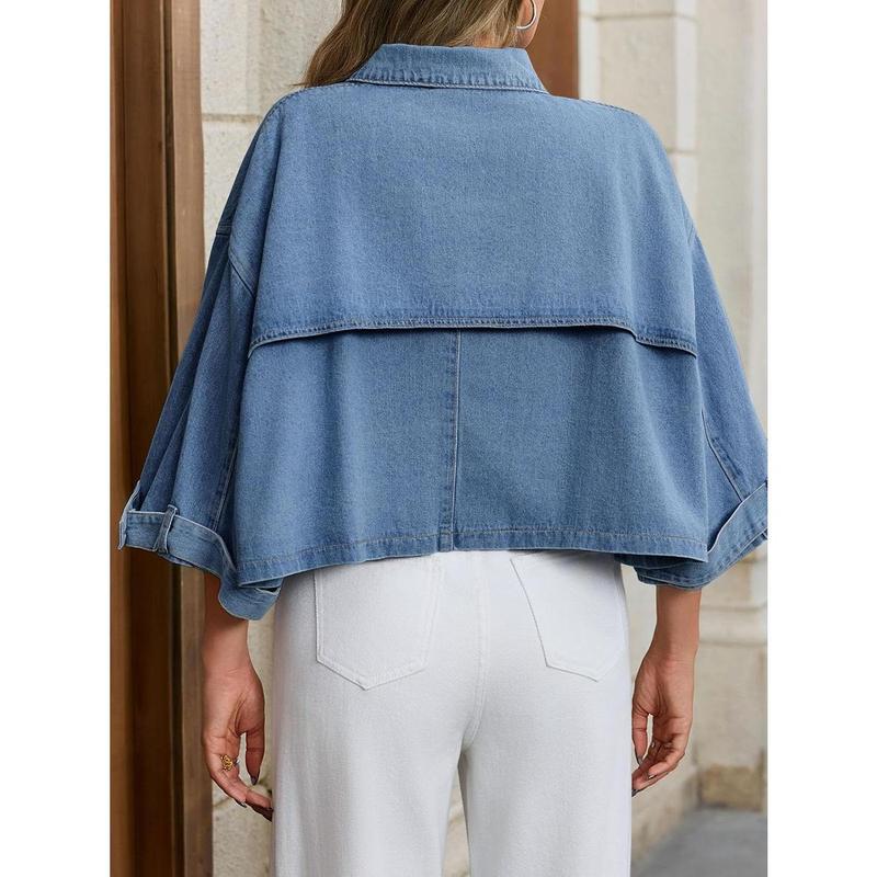 5. Womens Cropped Denim Jackets Casual Button Down Jean Shirt Shacket Loose 3/4 Sleeve Coat with Pockets