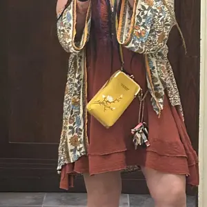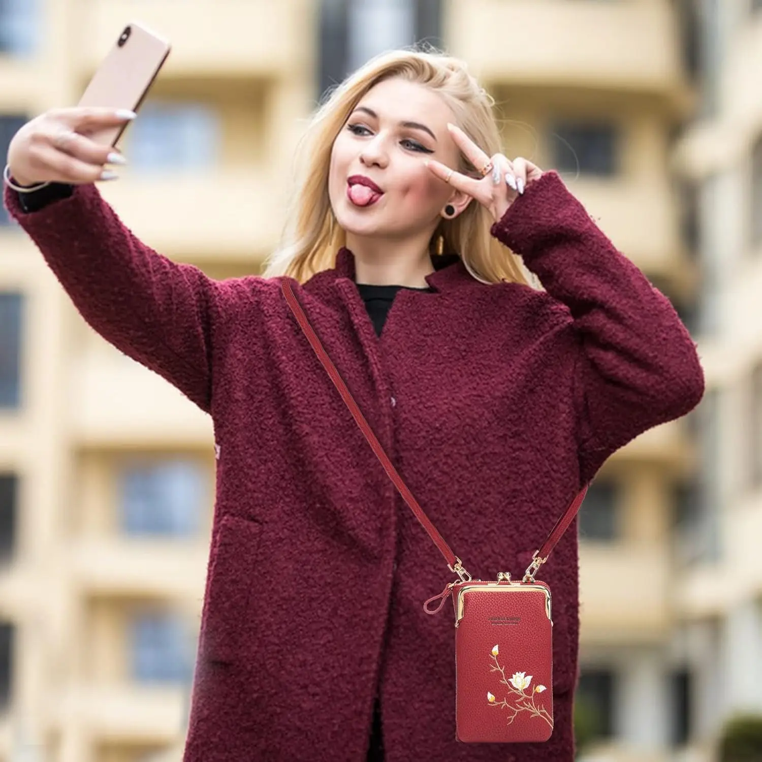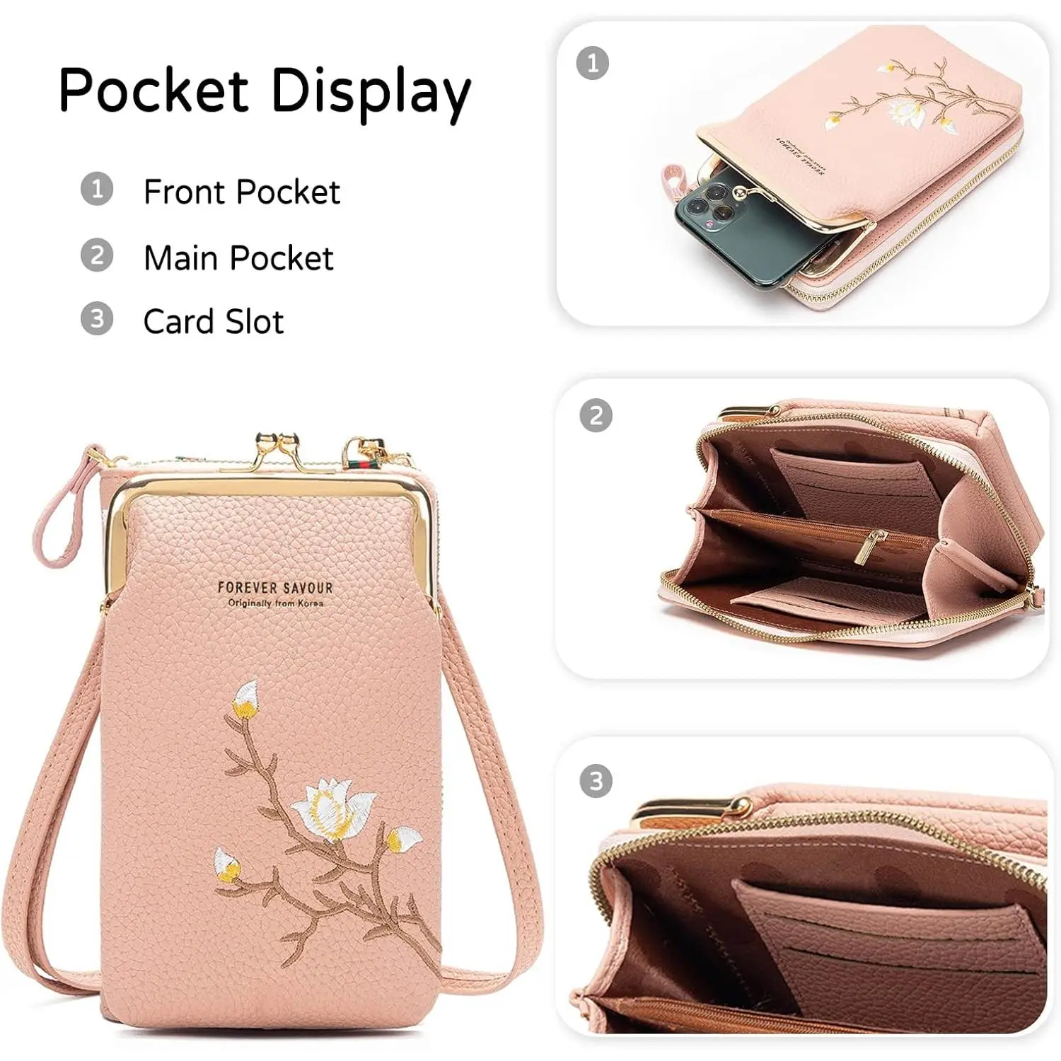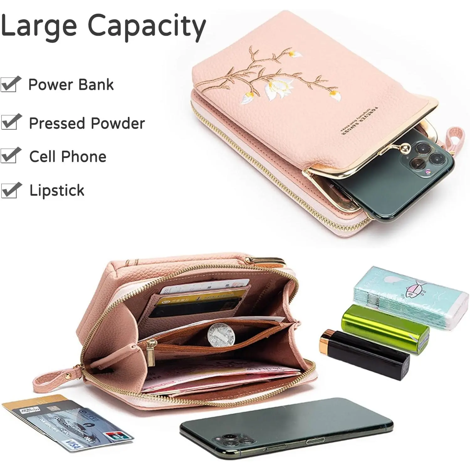 Size: 11x5x18 cm (LengthxWidthxHeight). Weight: 0.21 kg. This lightweight phone bag features 2 main compartments, 1 phone pocket, 6 credit card slots, and 1 coin pocket. It's roomy for essentials like cellphones, credit cards, change, cash, lipsticks, keys, and more. Perfect for keeping your hands-free during outings.