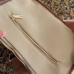 I’m very pleased with the quality of the material used. It feels soft and looks expensive. The size is perfect and spacious. It does have a strong odor but I wiped the outside with scented cleaner and scented drier sheets to the inside and it worked like a charm. Bought a 2nd bag in beige.