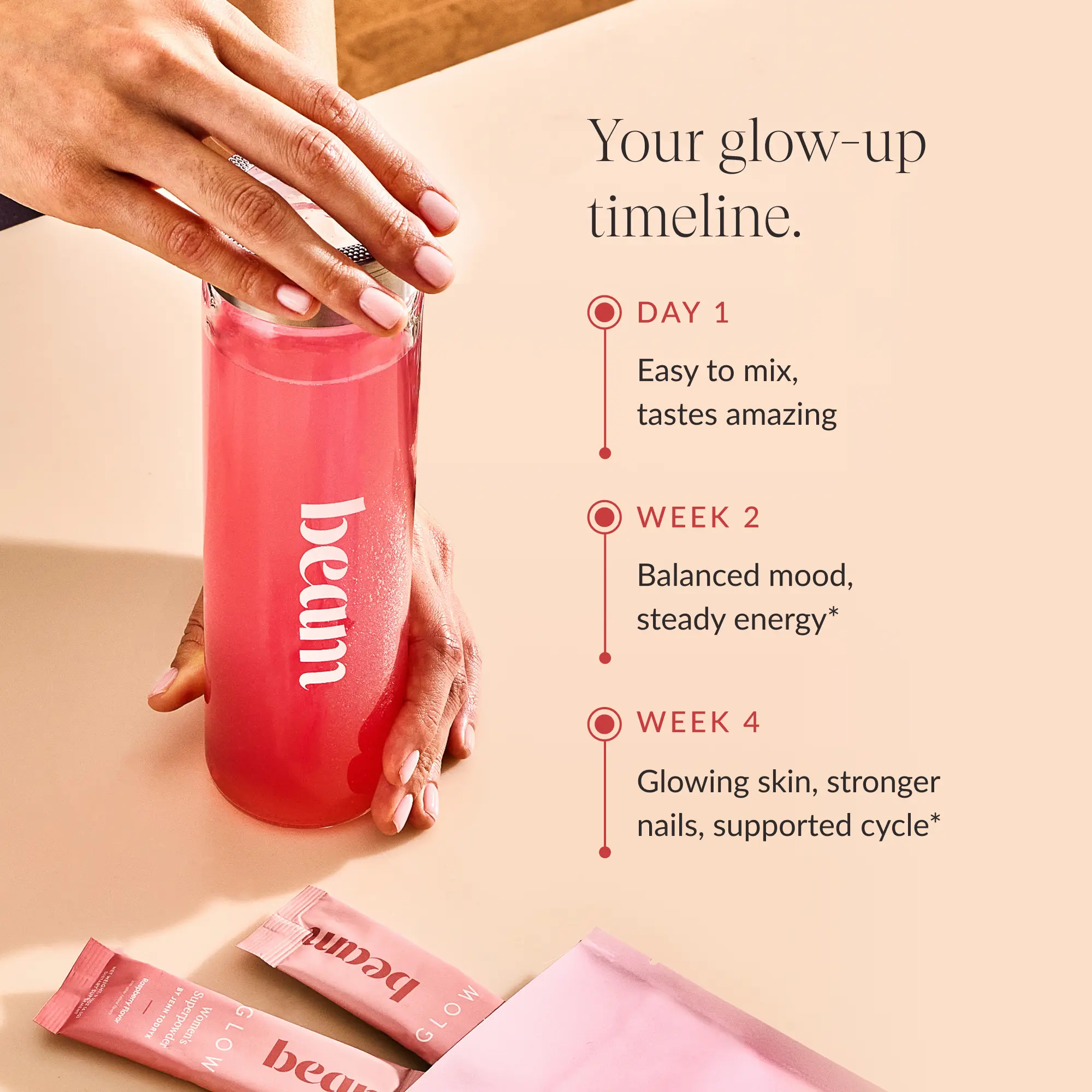 Beam Glow is a nourishing daily drink mix made to support women’s wellness from within. Formulated with 18 key ingredients, it’s designed to complement your routine and help you feel balanced, refreshed, and radiant.