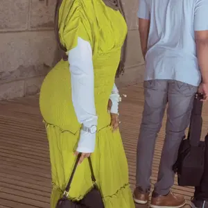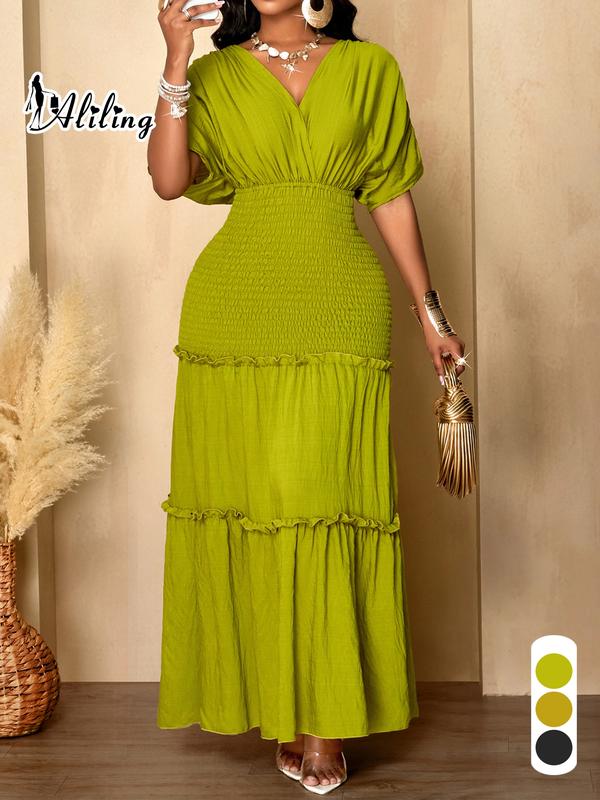 Aliling Elegant Women Dress Waist Shirred Long Dresses V Neck Short Sleeve Slim Solid Female Bodycon Casual Daily Wear Clothing