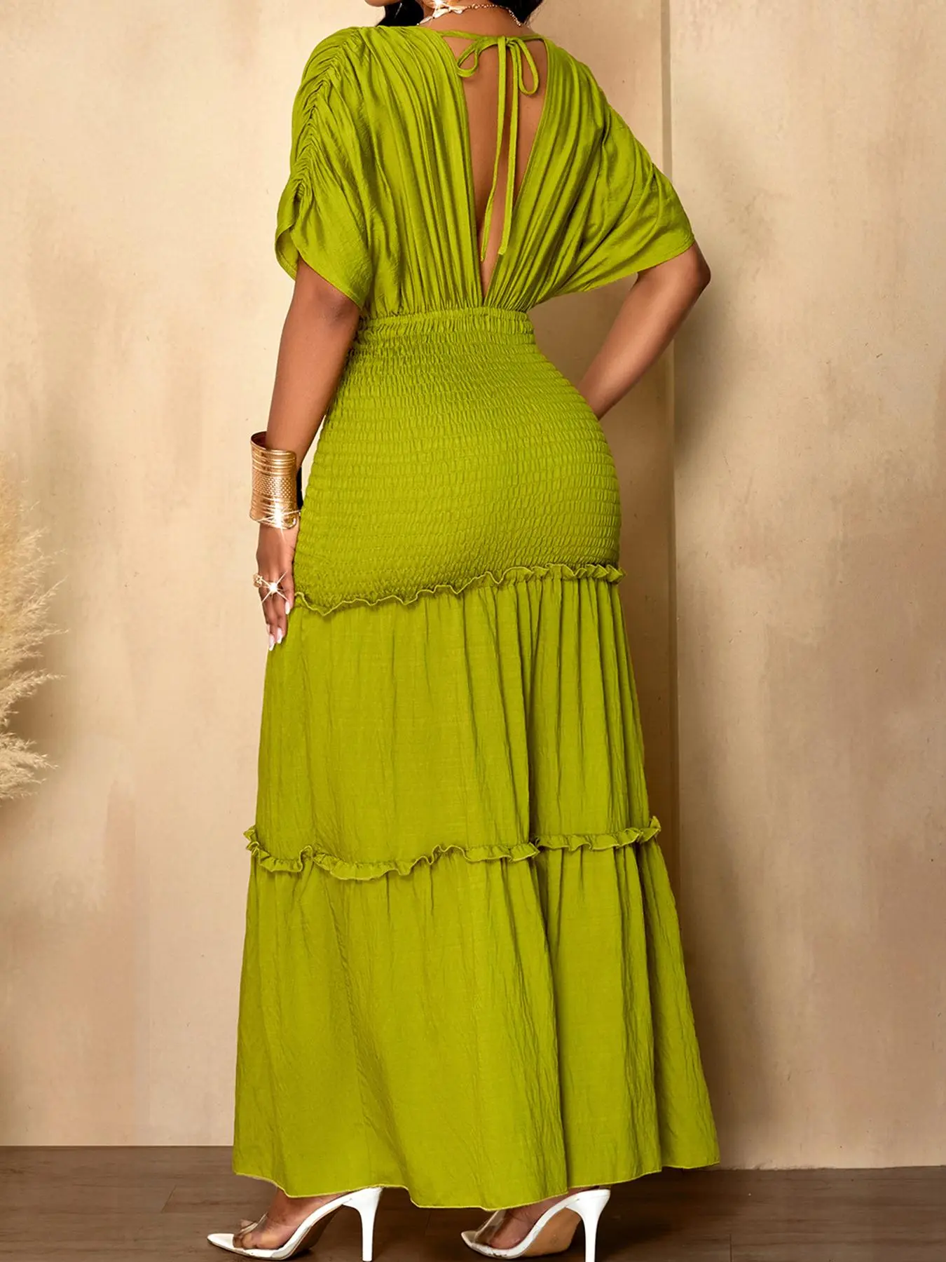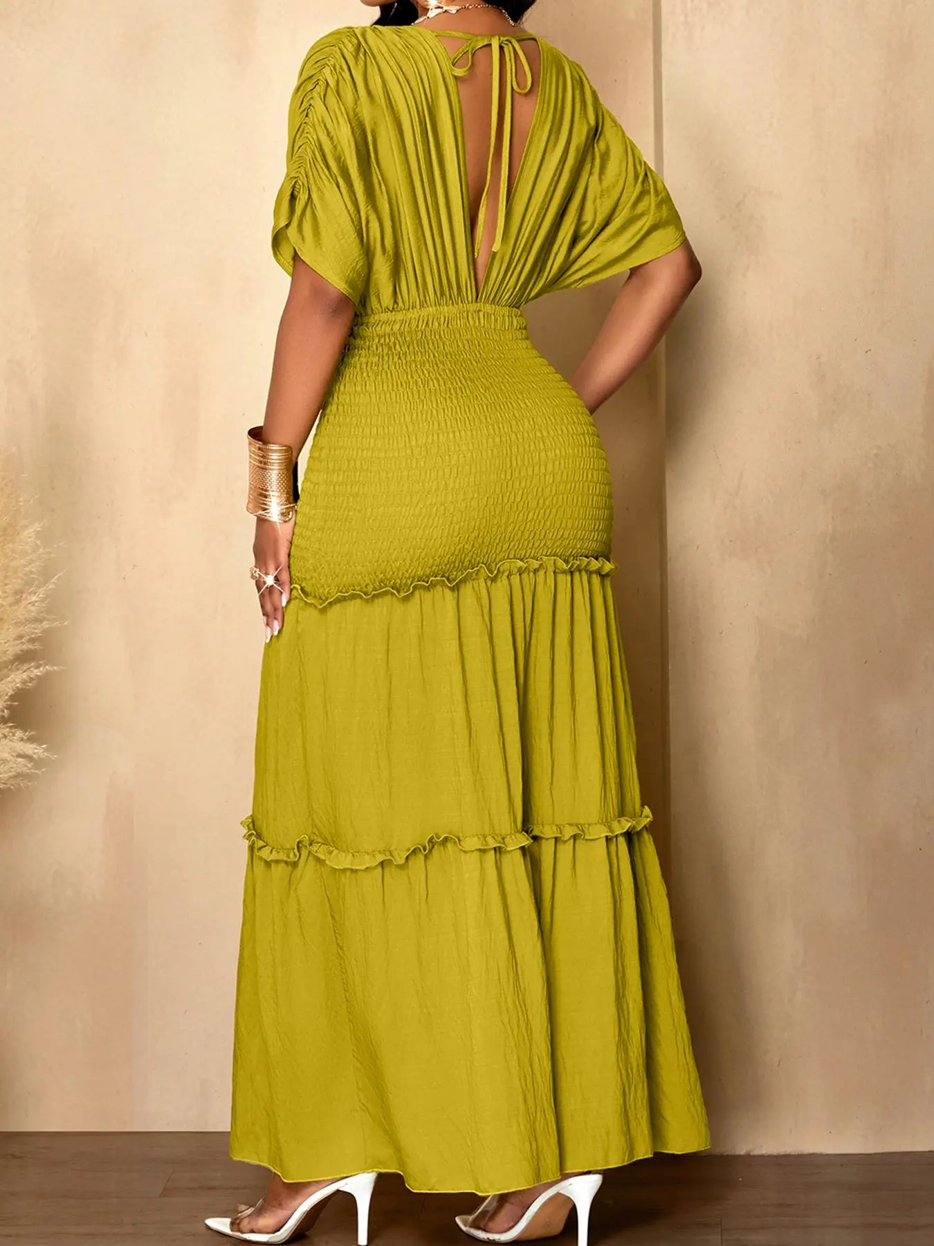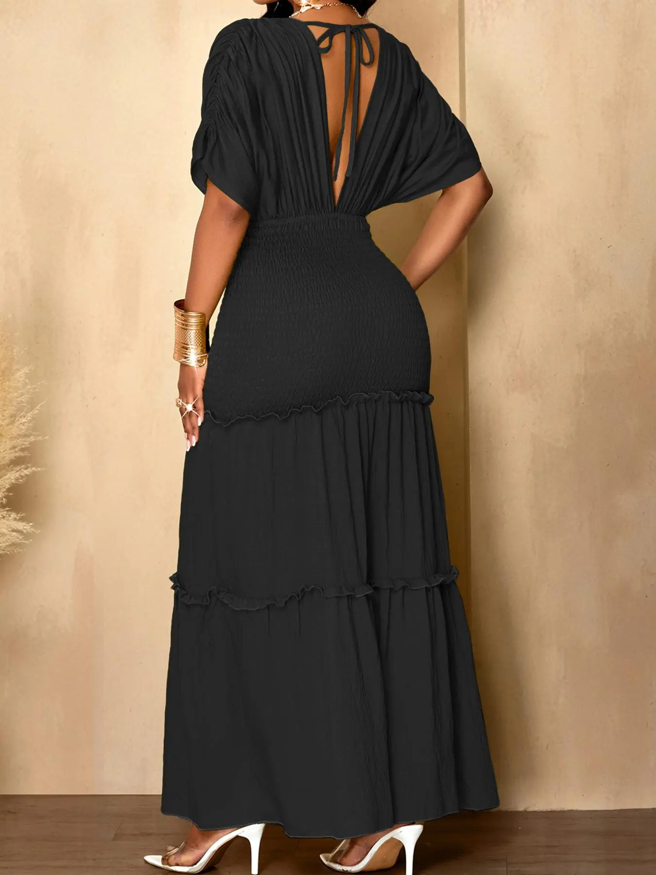 5. Aliling Elegant Women Dress Waist Shirred Knit Long Dresses V Neck Short Sleeve Slim Fitted Solid Female Bodycon Casual Daily Wear Clothing