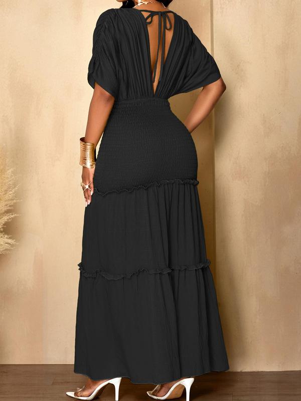 5. Aliling Elegant Women Dress Waist Shirred Long Dresses V Neck Short Sleeve Slim Solid Female Bodycon Casual Daily Wear Clothing