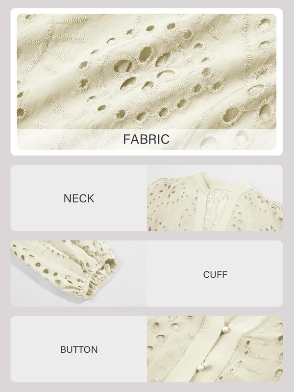 5. Womens Deep V Neck Eyelet Blouses Tops Dressy Casual 3/4 Balloon Sleeve Cotton Button Down Shirts Cute Elegant Autumn Fitted Style