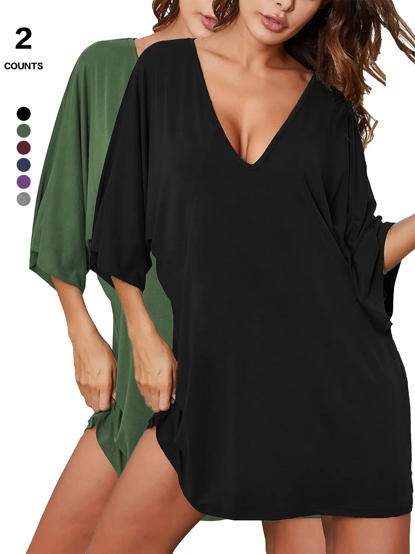 5. 2026 Women's Sleepshirt Deep V Neck Nightgown Batwing Nightshirt Oversized Sleepwear