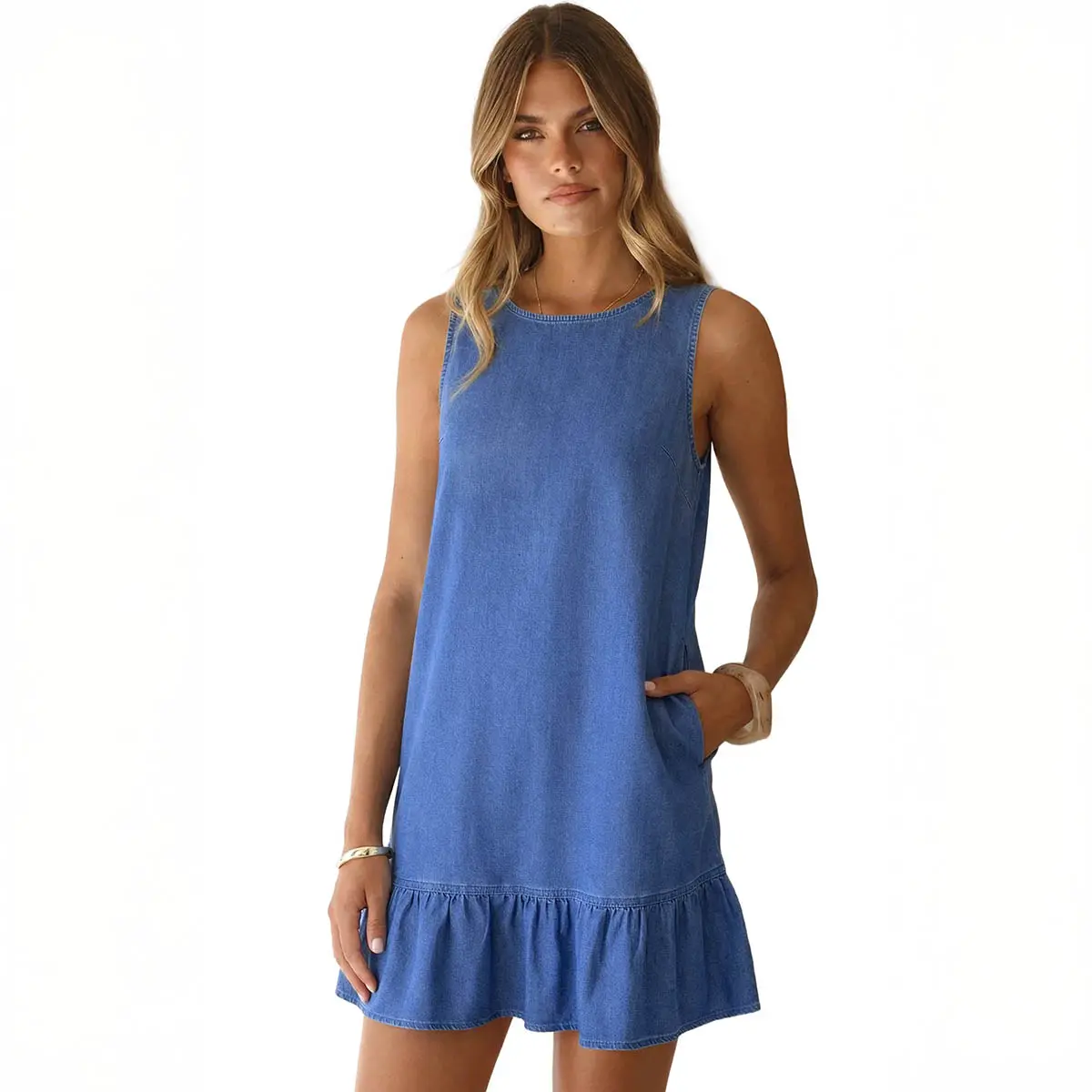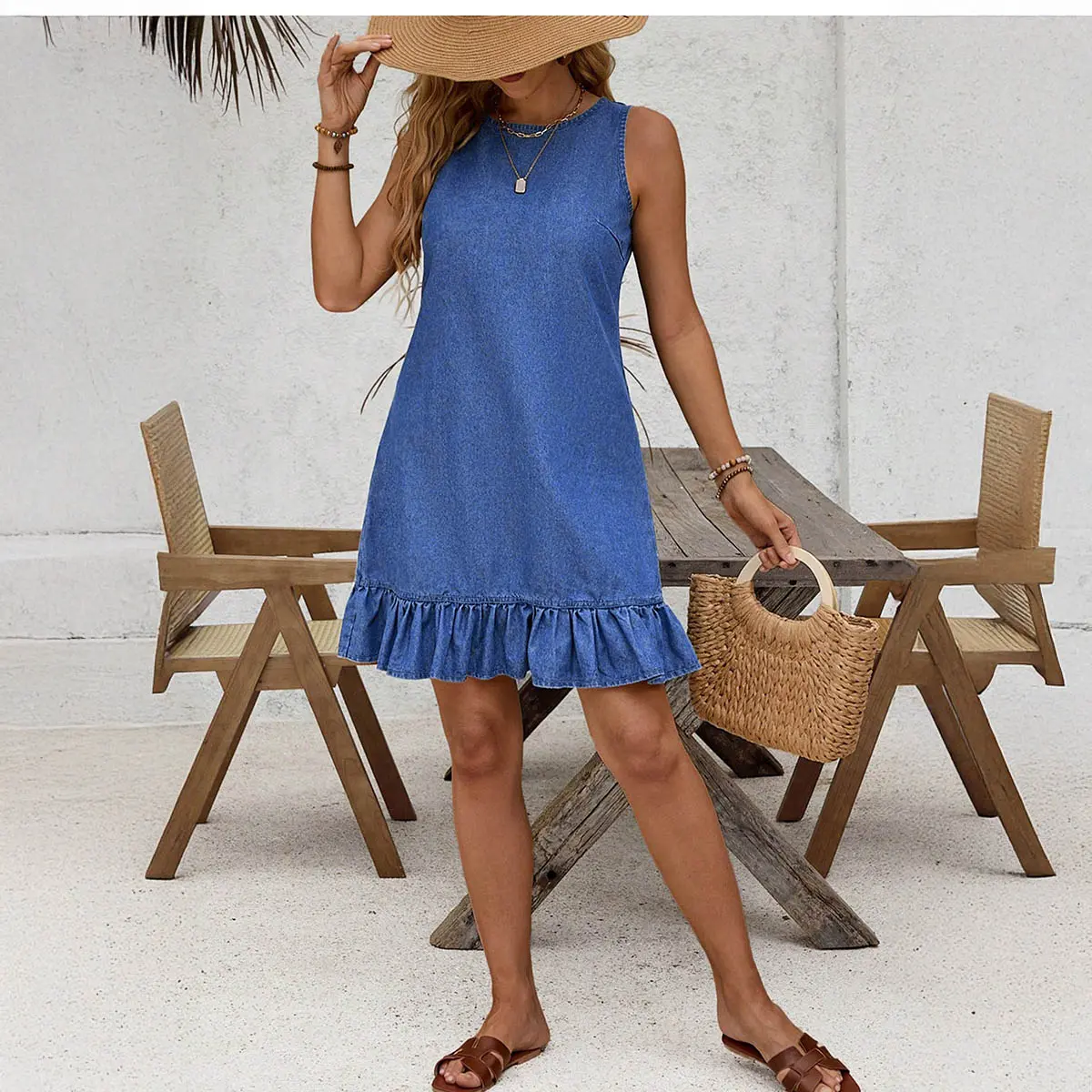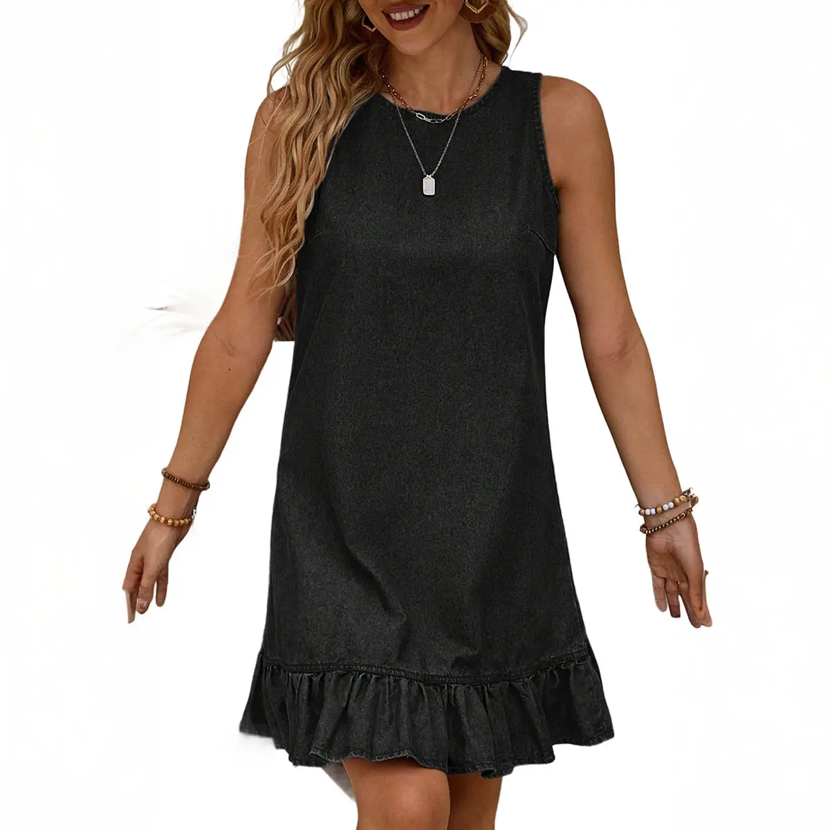 Features:This denim dress features a sleeveless round neck design and a ruffled hem detail—casual yet playful, fitting a relaxed and chic daily aesthetic. Its loose silhouette offers great body inclusivity, hiding body flaws while keeping you comfortable, blending casual ease with subtle sweetness.