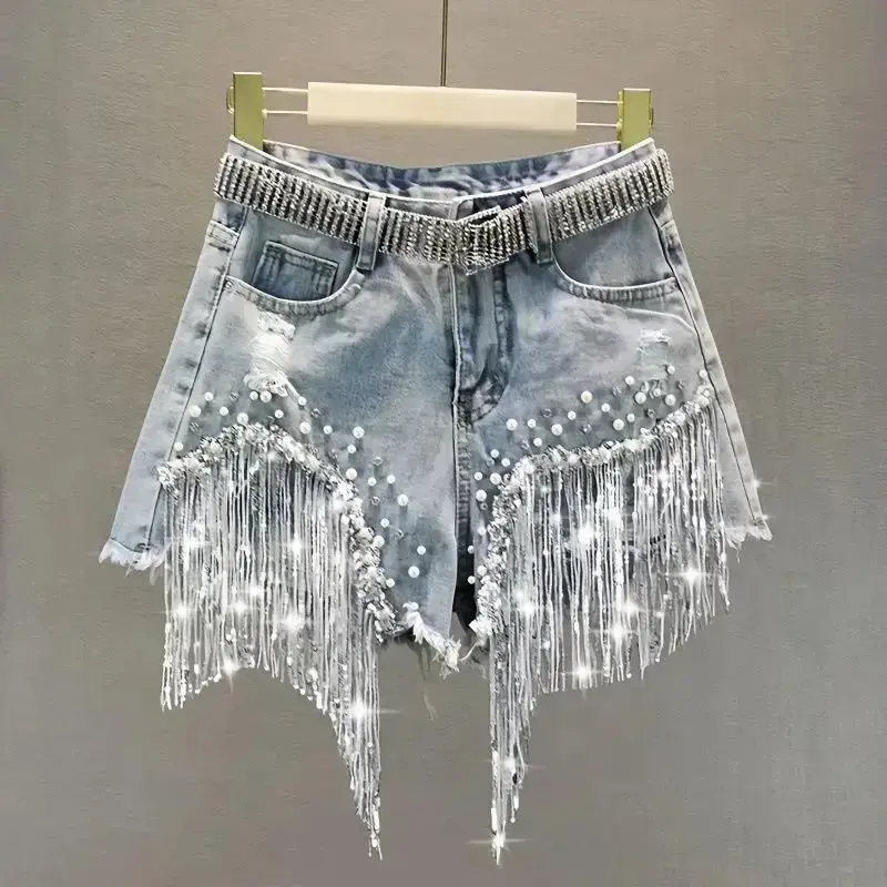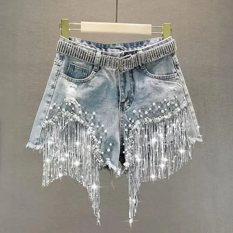 5. Denim Shorts Women's 2025 Summer Clothes New European High Waist Thin Heavy Industry Beaded Sequined Fringed Broken Copper Jeans