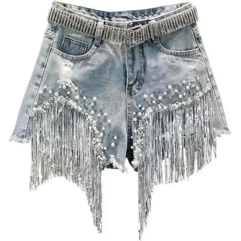 Denim Shorts Women's 2025 Summer Clothes New European High Waist Thin Heavy Industry Beaded Sequined Fringed Broken Copper Jeans