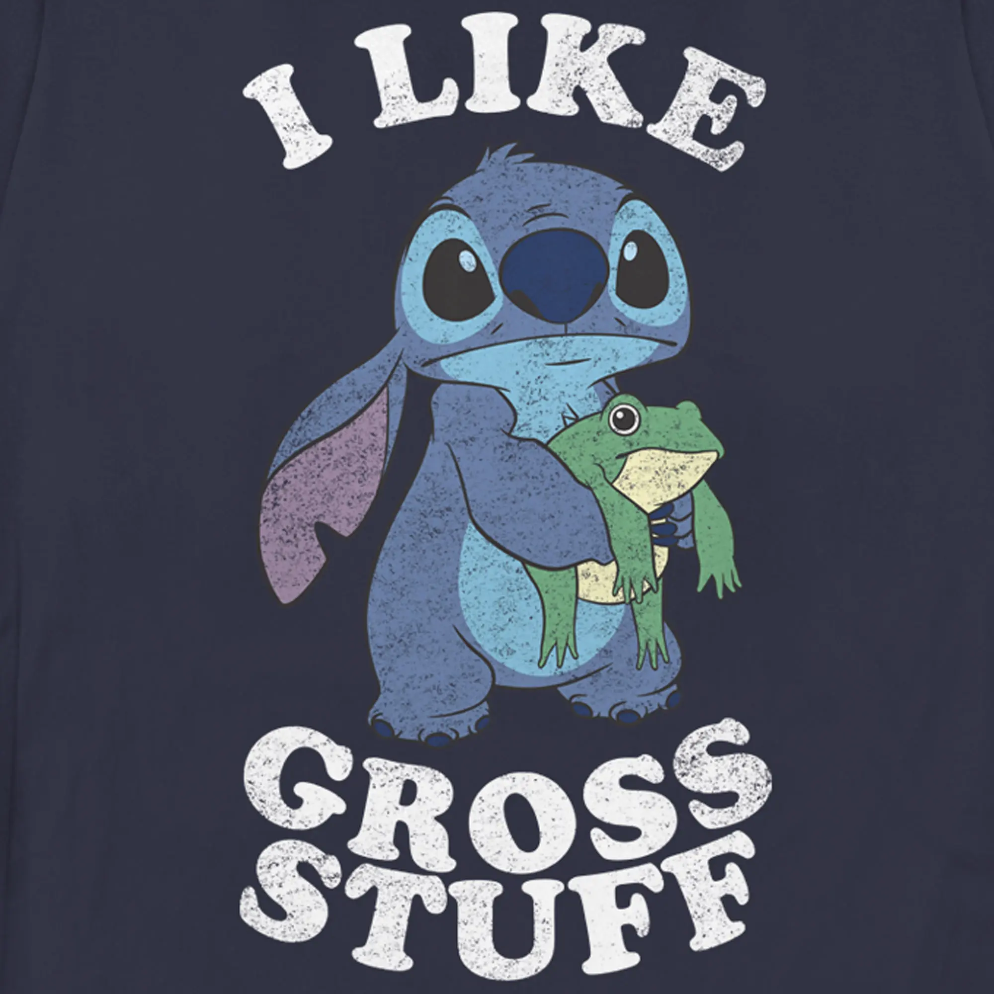 Strut your stuff with this stylish new women's t-shirt that is perfect for every occasion! Featuring a distressed graphic of a cute innocent-looking Stitch holding a slimy green frog, along with the phrase: "I Like Gross Stuff" in white across the front.