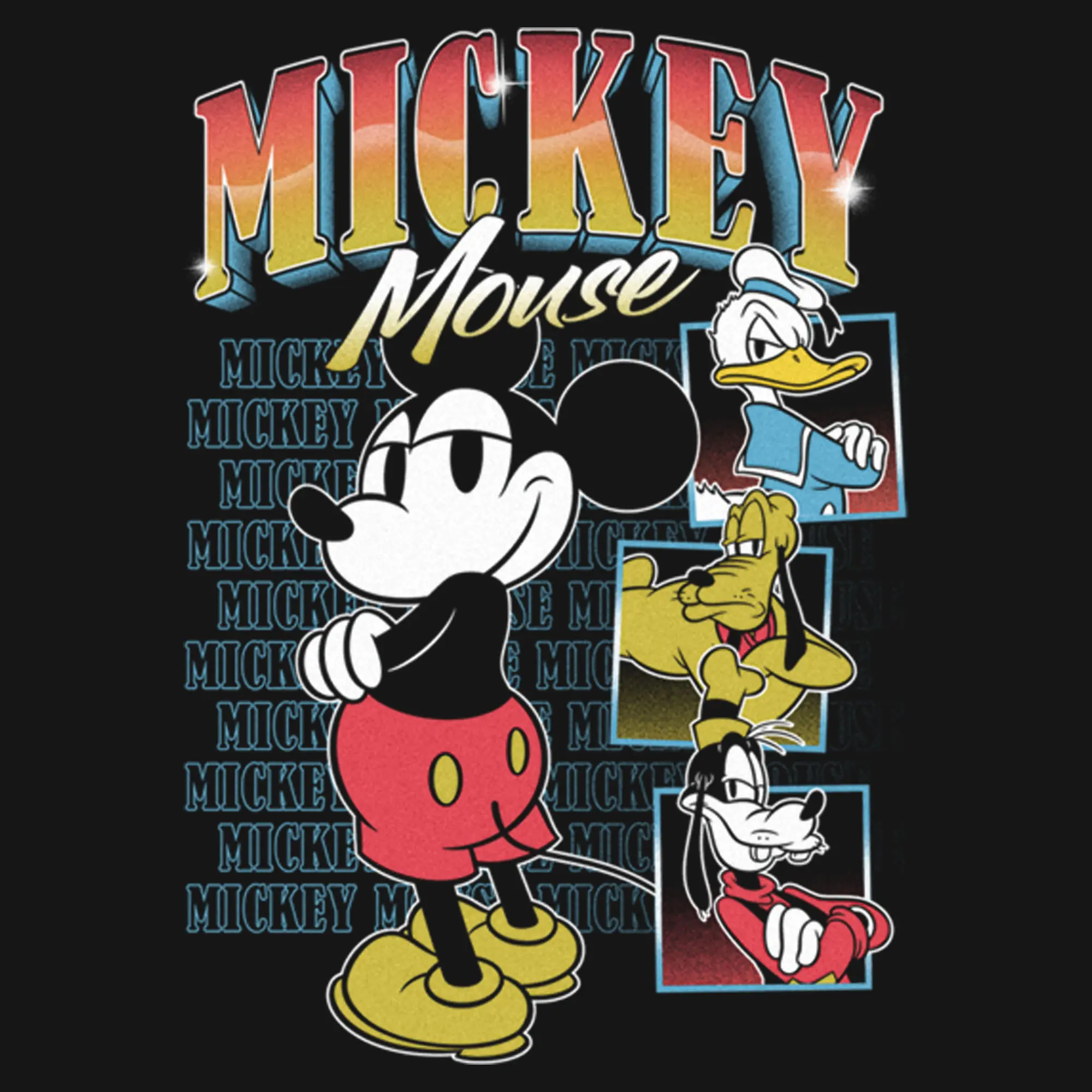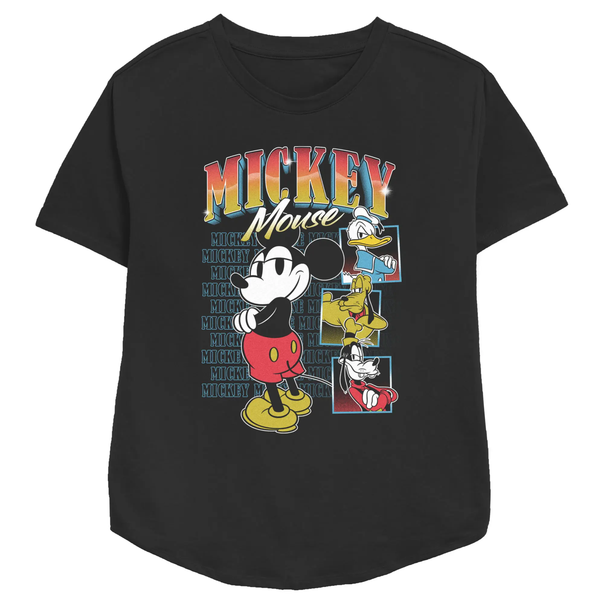 Strut your stuff with this stylish new women's relaxed fit t-shirt that is perfect for every occasion! Featuring retro versions of Mickey, Donald, Pluto, and Goofy posing cool across the front, along with Mickey's name printed in colorful, shiny letters.