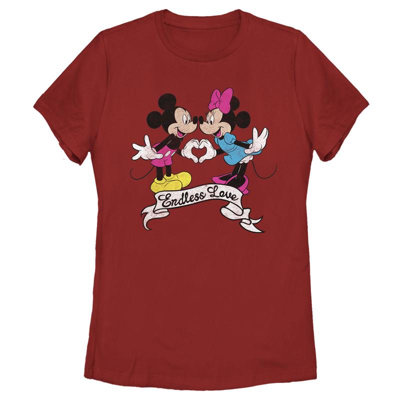Strut your stuff with this stylish new everyday women's t-shirt that is perfect for Valentine's Day celebrations! Featuring Mickey Mouse and Minnie Mouse forming a heart with their hands and the text: "Endless Love," below them.