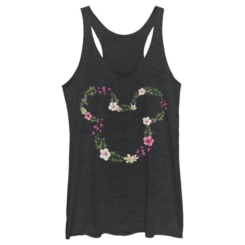 Strut your stuff with this stylish new everyday women's racerback tank top that is perfect for every occasion! Featuring the Mickey Mouse silhouette logo across the front formed by tropical plants like Hibiscus, Plumeria, and Bougainvillea flowers.