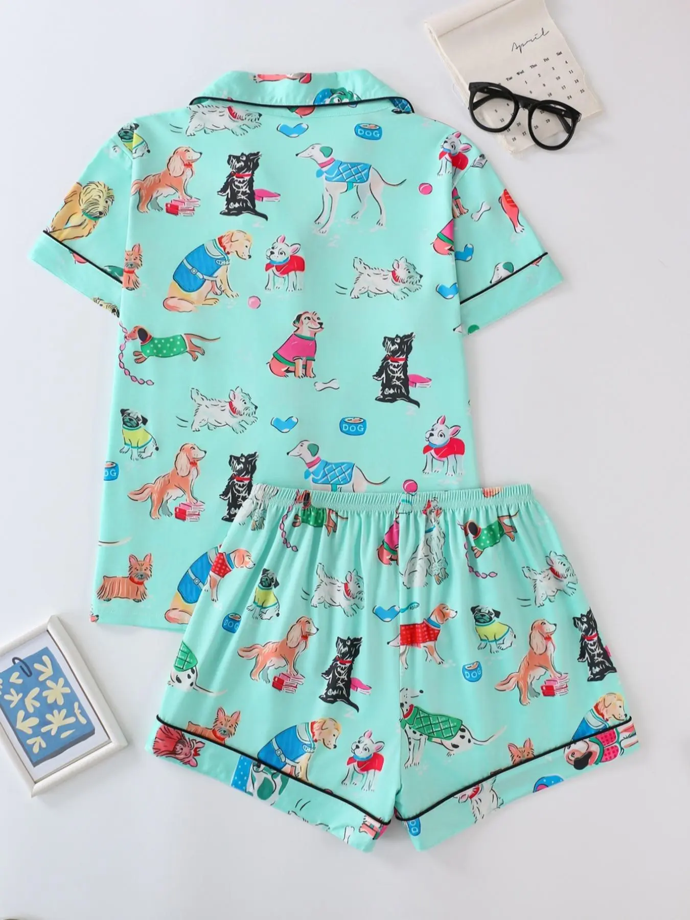 Women's Dog Print Top & Shorts Pajama Two-piece Set, Casual Comfy Short Sleeve Top & Shorts Pajama Set, Ladies Sleepwear for All Seasons, Loungewear, Womenswear, Sleep Pajamas Shorts, Cozy Loungewear