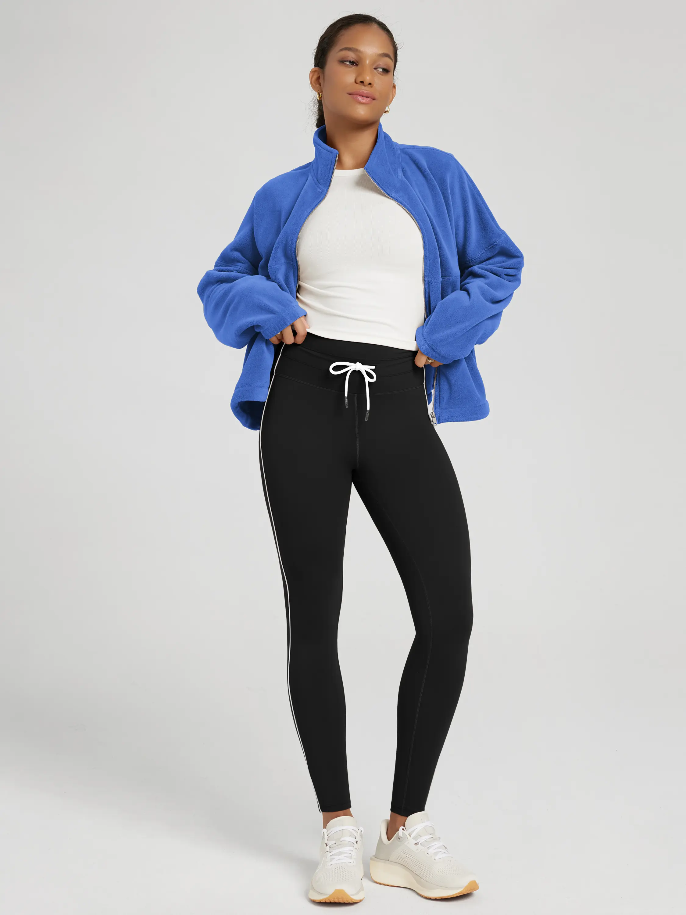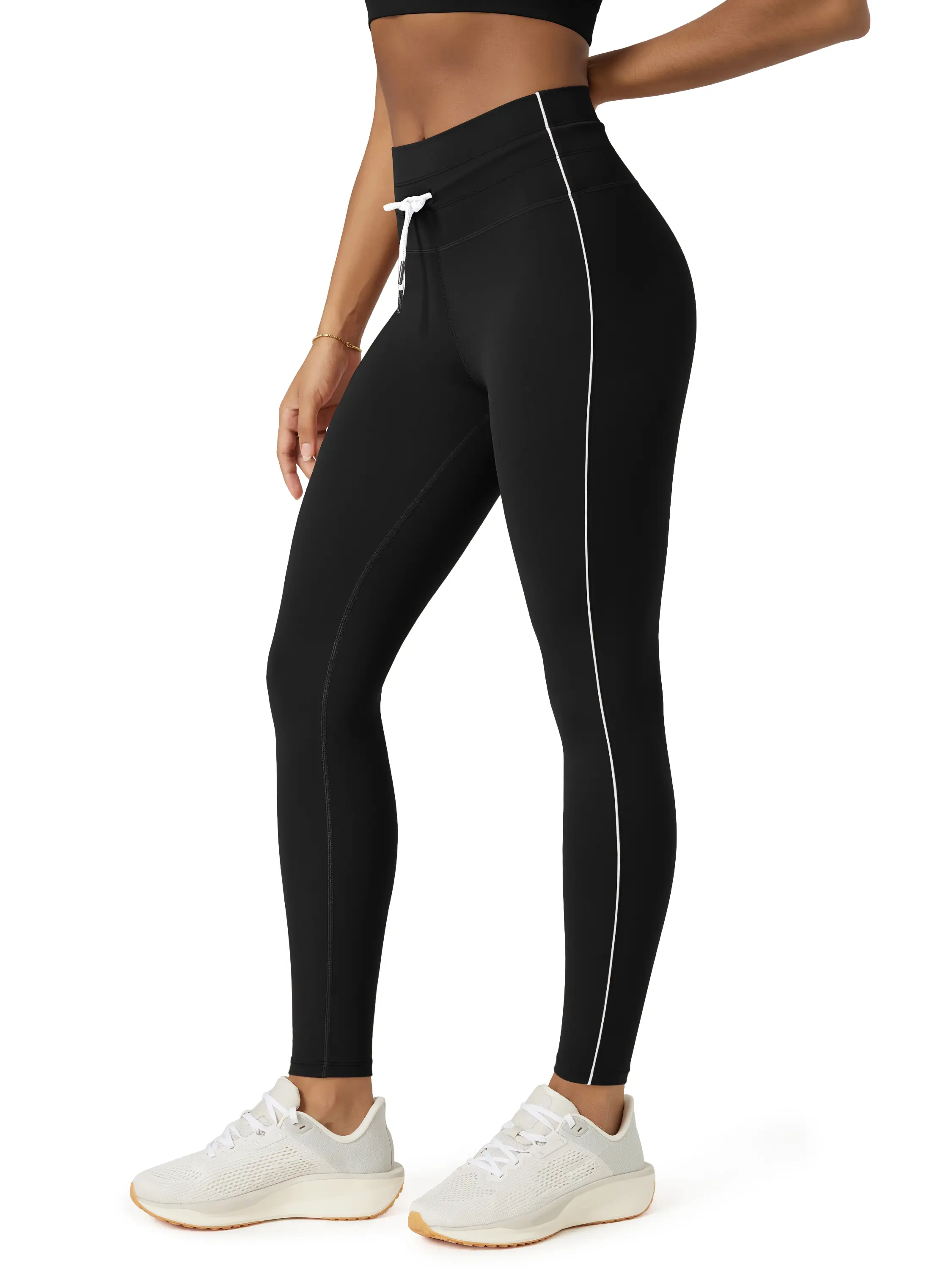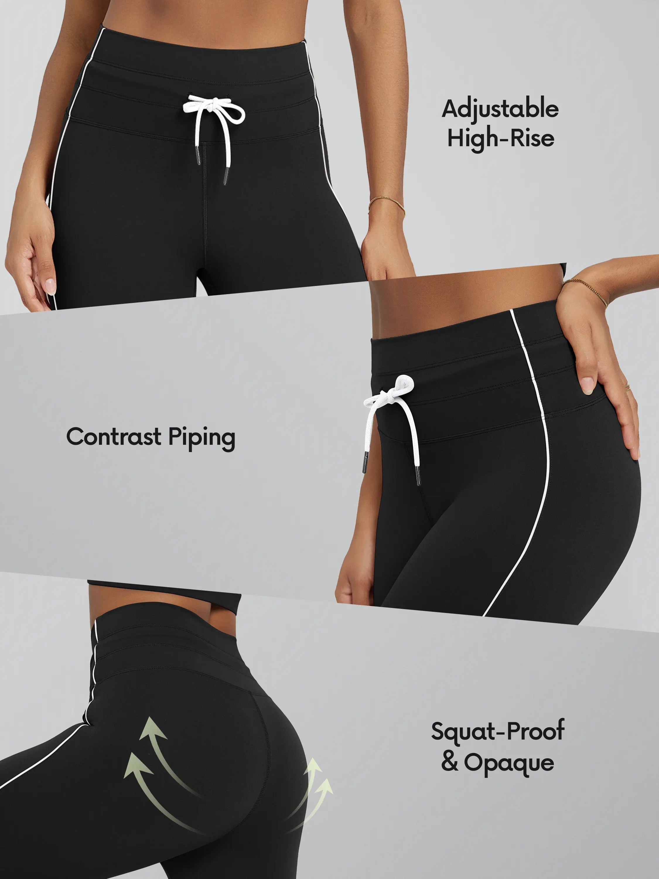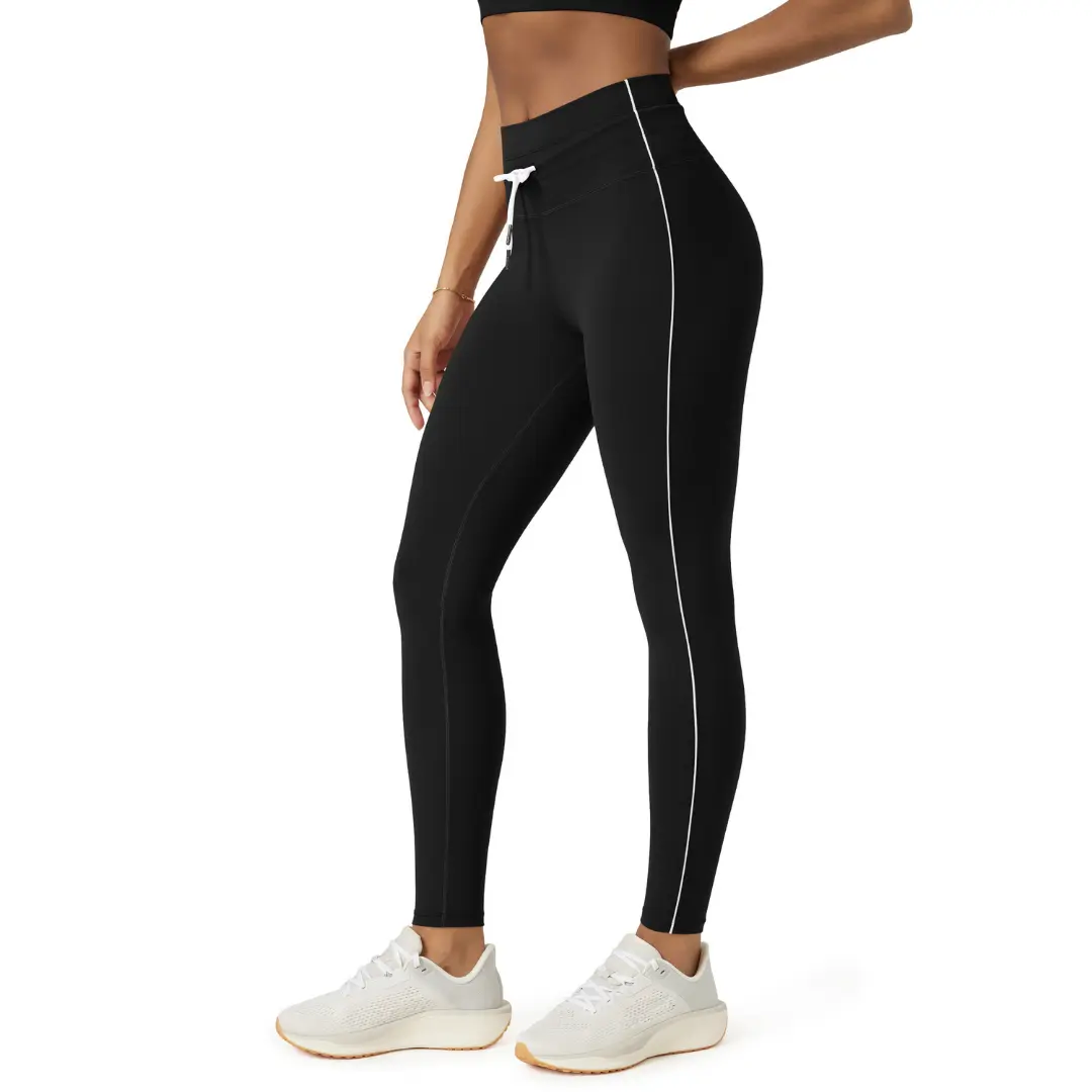 ·High waist with adjustable drawstring for a supportive fit; contrast piping adds style.