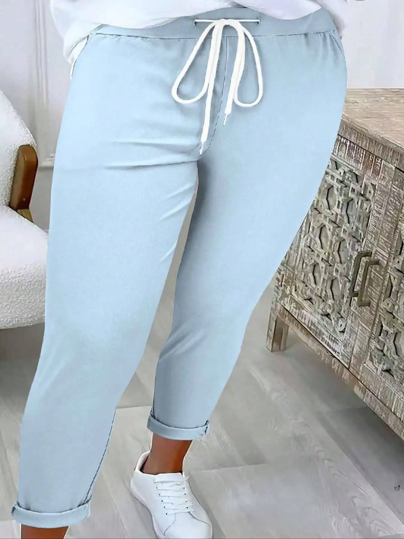 Nice pants for the ladies that are not tall. Elastic waist does not stretch much so snug fit or possibly size up if you want more comfort. I am a size 8 and ordered a large.