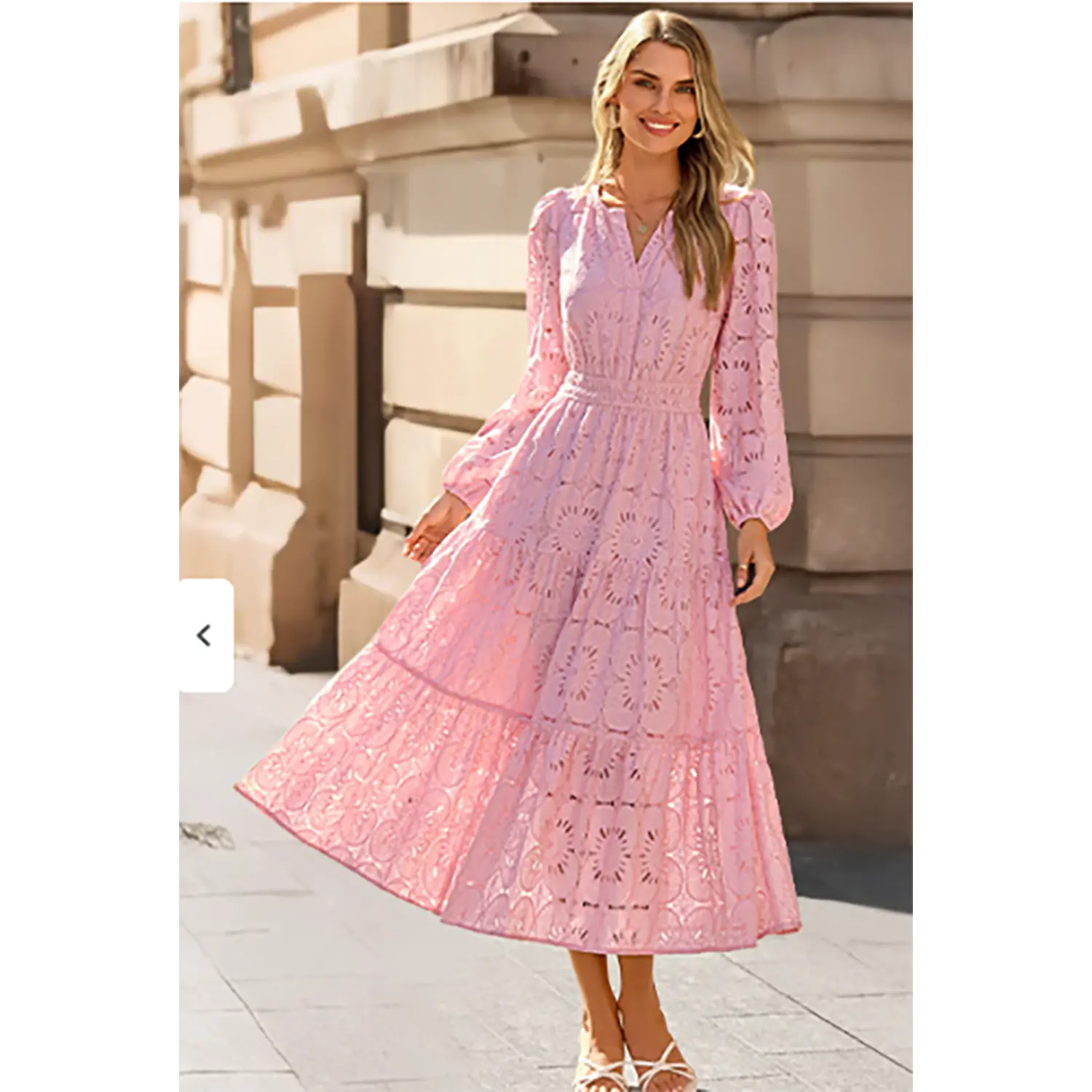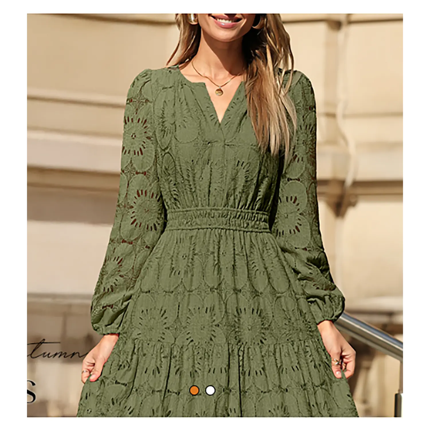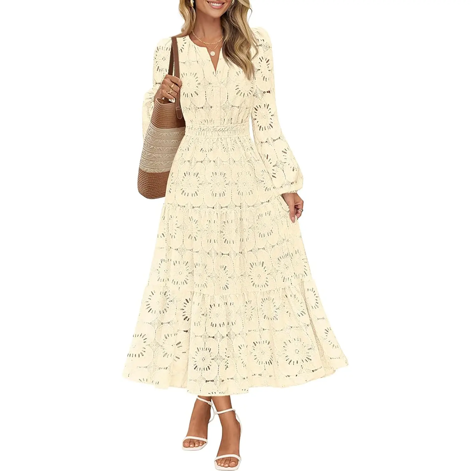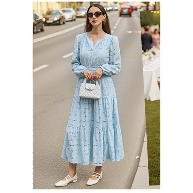 ·Features: This flowy dress features a notch v neck, long puff sleeve, elastic high waist, two side pockets, swing hemline, ankle length, A line shape, hollow out floral eyelet detail, double layered design, lace fabric, wedding guest dress for women 2025