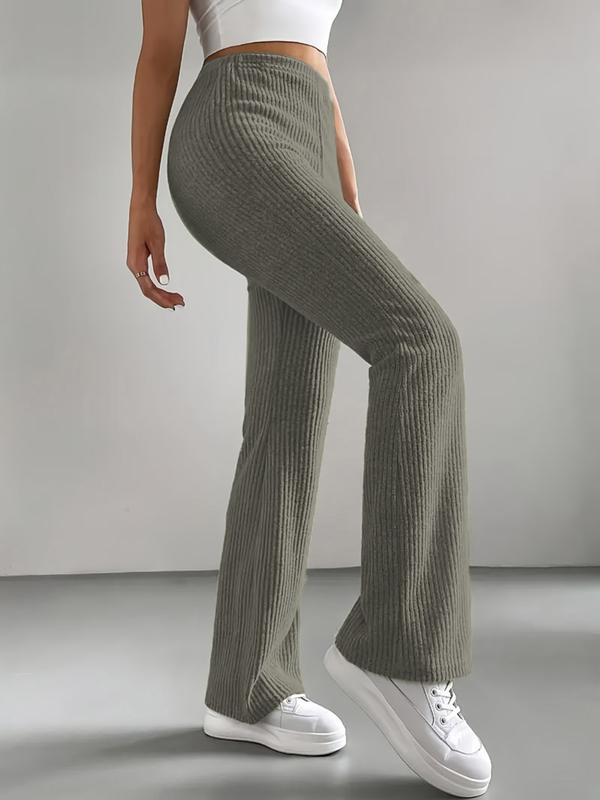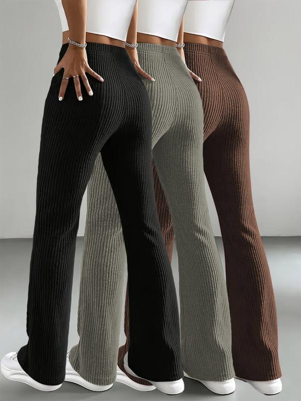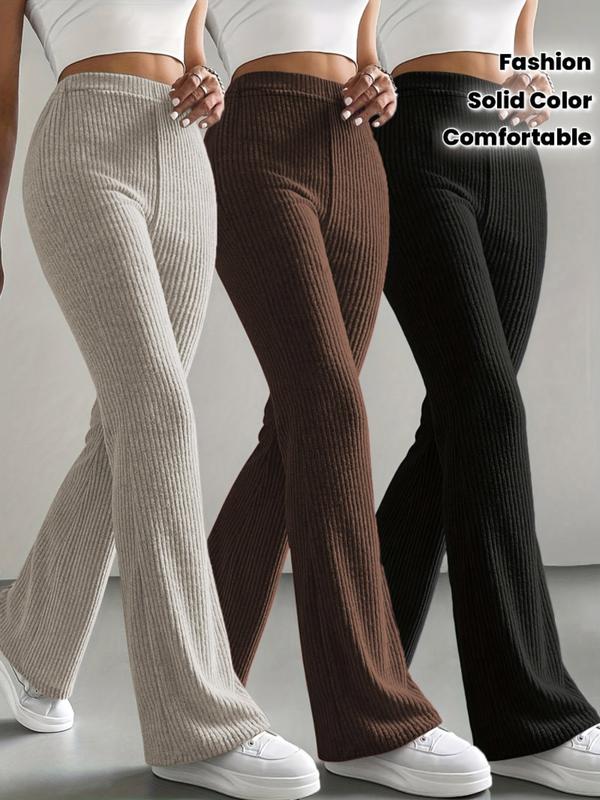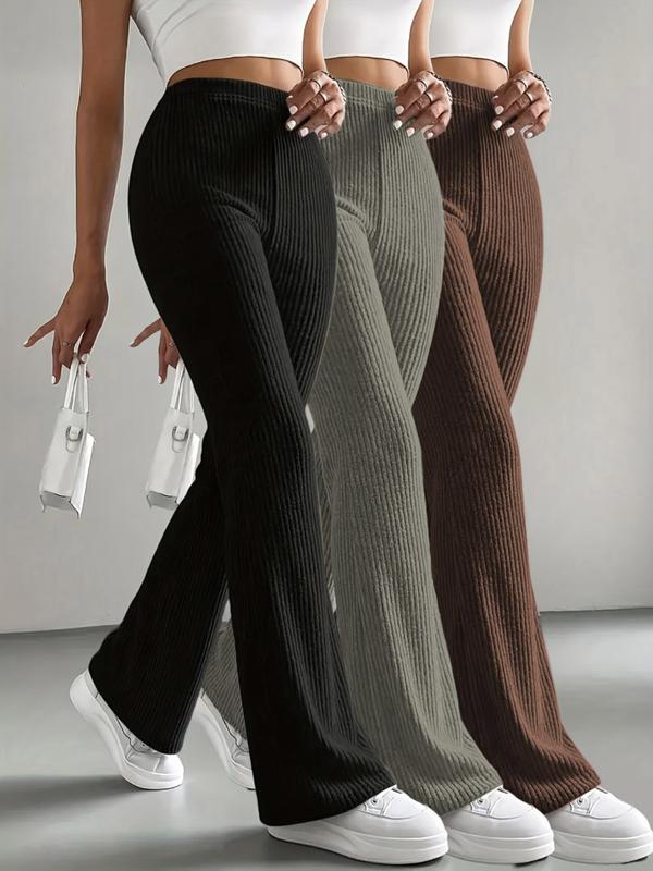 Women's Home Pants Set, 3-Piece Plain Ribbed Striped Straight-Leg Bell Bottoms, Comfortable Casual Long Pants for Spring Fall Winter