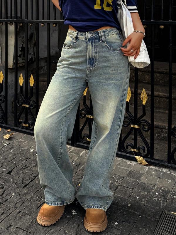 Women's Elastic Wide Leg Jeans, Vintage Style Casual Fashion Denim Jeans, Trendy Relaxed Fit Long Jeans for All Seasons