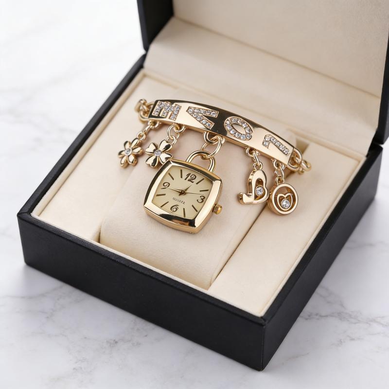 This watch is an excellent choice for gifting. It combines functionality with style, making it suitable for various occasions. The combination of letters rhinestones and a flower pendant ensures it stands out. Ideal for ladies who appreciate both practicality and aesthetics in their accessories.