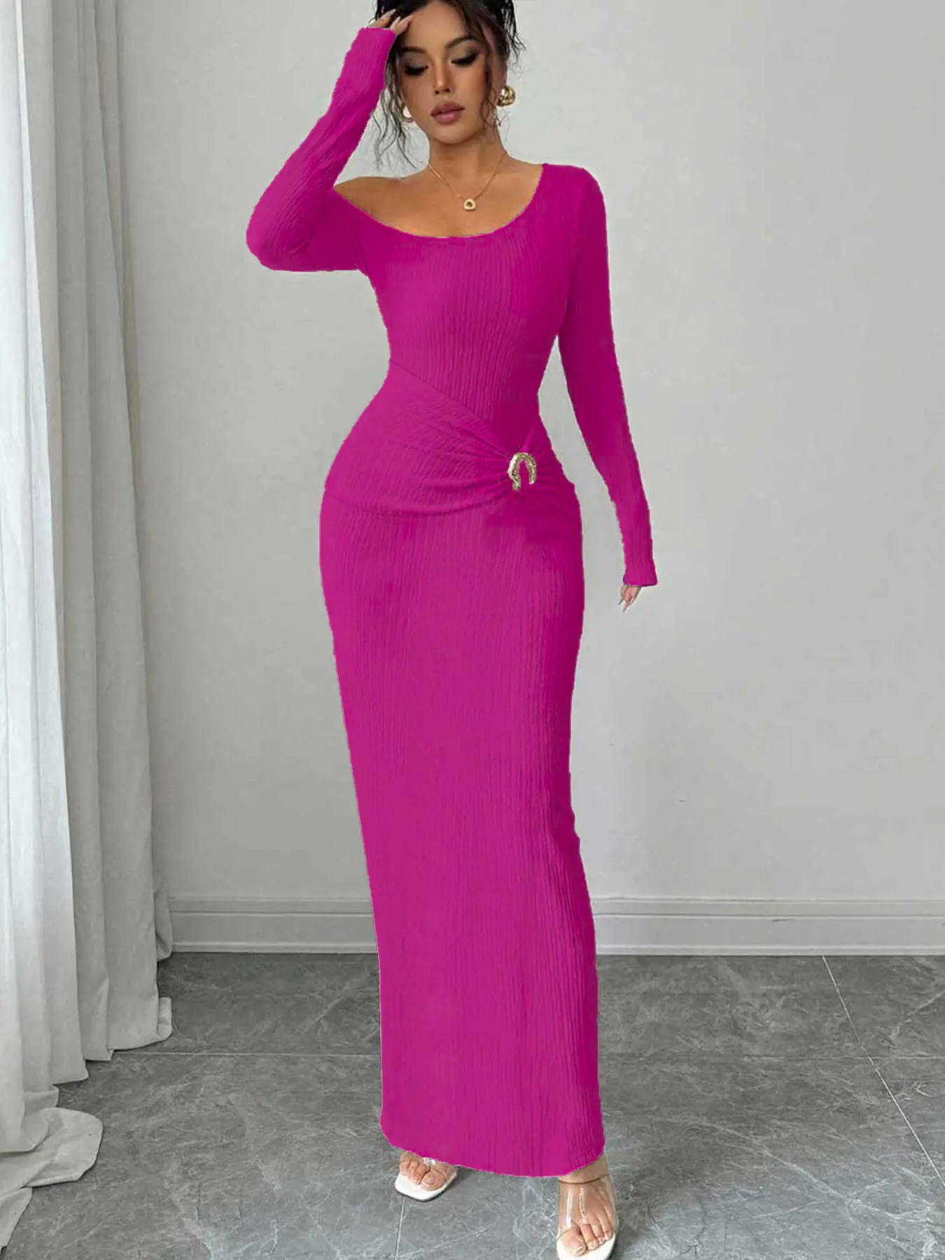 レディース エレガントなアシンメトリーネックラインドレス、無地のツイストテクスチャー、タイトフィットのパーティードレス、通勤スタイル、オールシーズン対応、春 #レディーススーツ #ミニワンピース #ニットワンピース #マタニティファッション #レディースアパレル #sheinクリスマス感謝祭 #ロングワンピース #春ワンピース #promdress #cocktaildress
