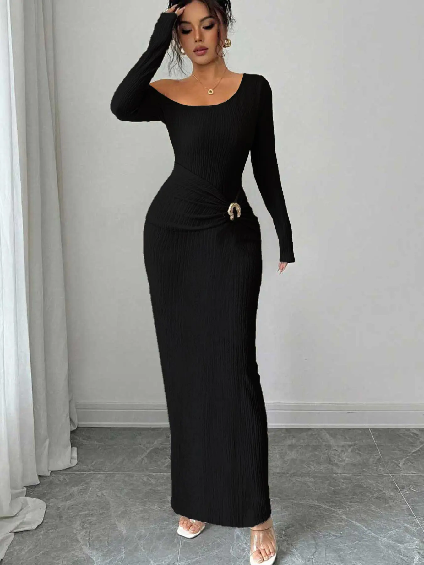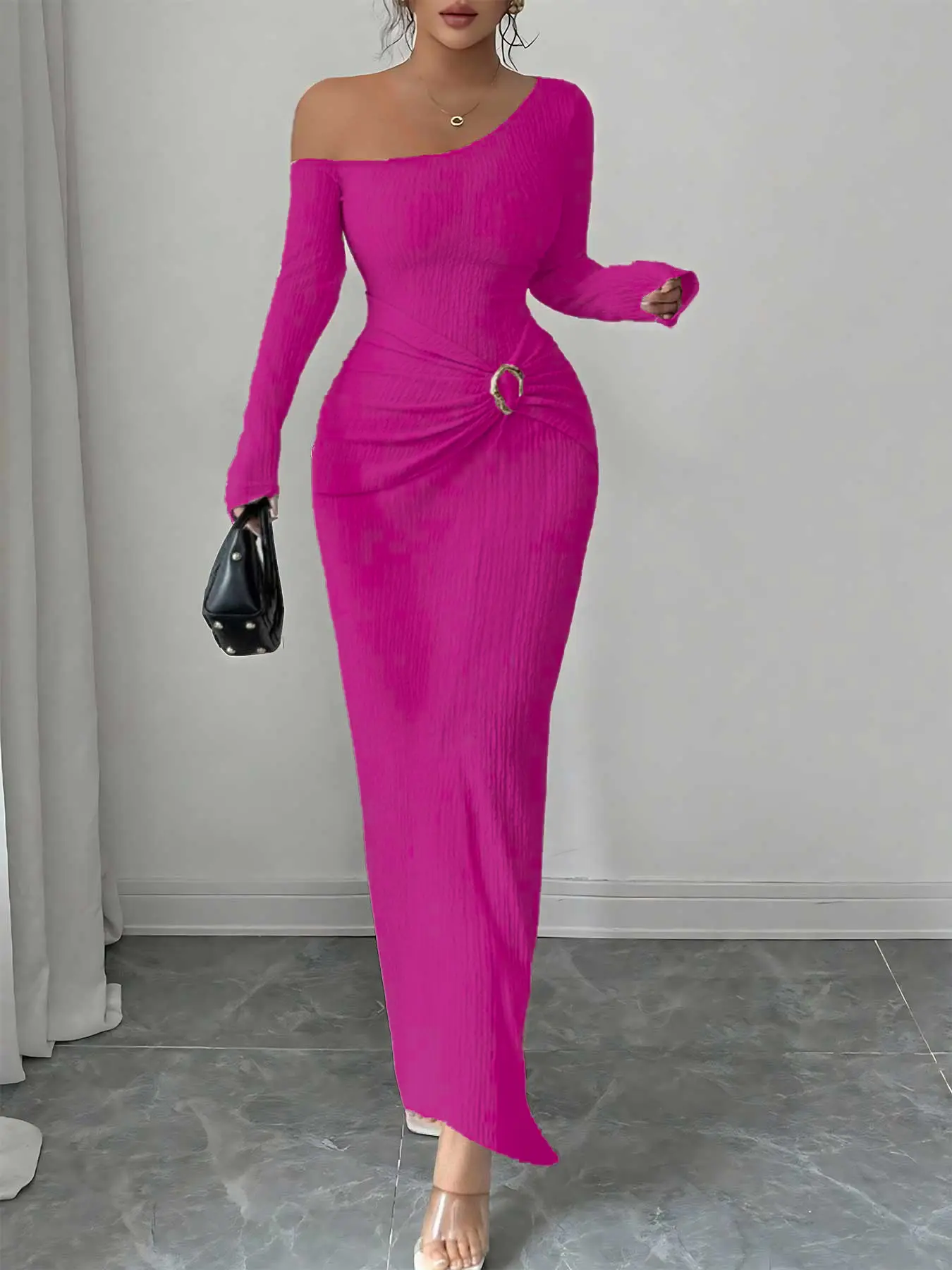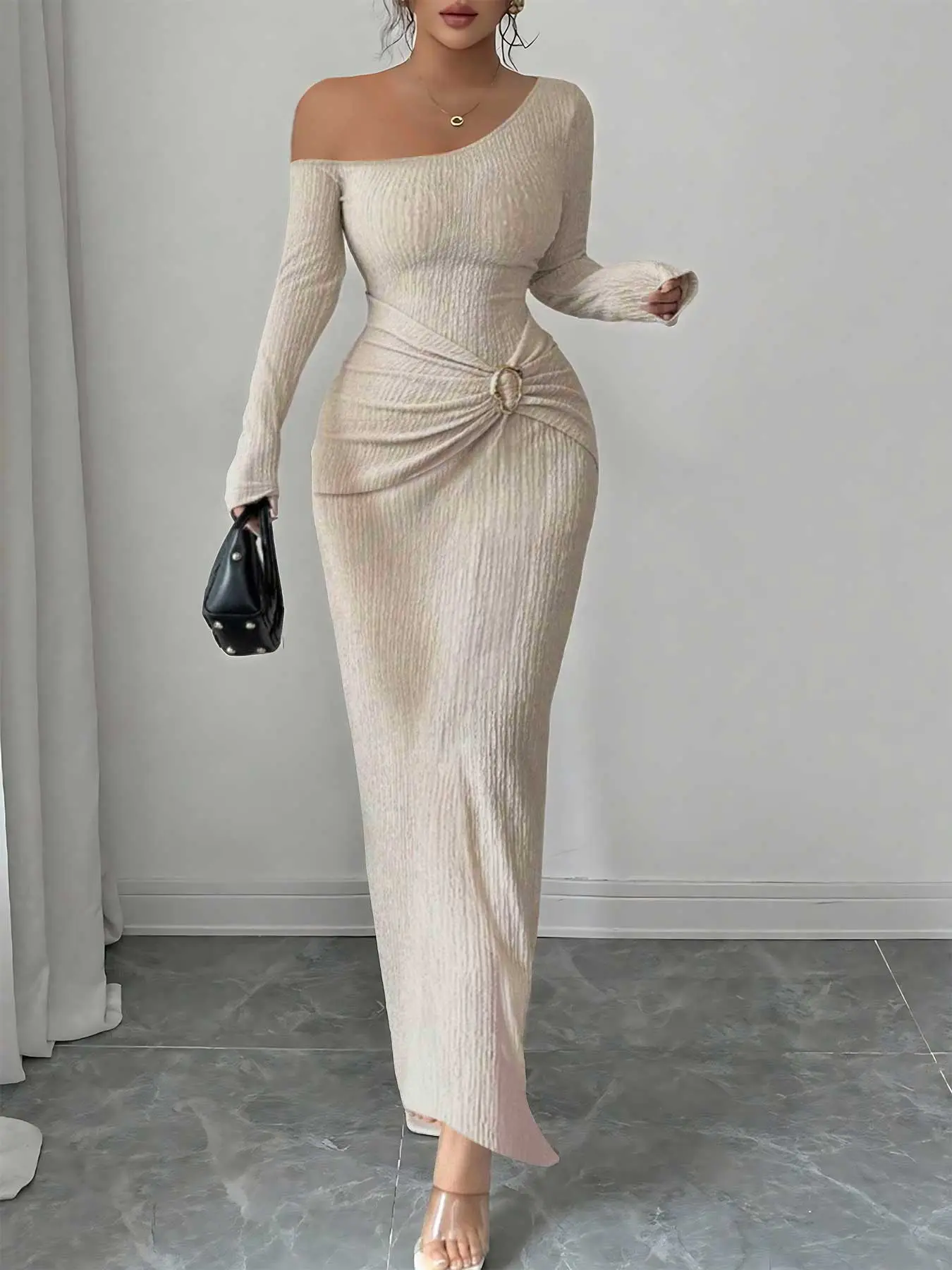 女性用エレガントなアシンメトリーネックラインドレス、無地、ツイストテクスチャー、タイトフィット、パーティーガウン、通勤スタイル、オールシーズン対応 #レディーススーツ #tiktokfashion #ミニワンピース #ニットワンピース #dresses #sheinクリスマス感謝祭 #에이블리옷추천 #shakiracollection #ロングワンピース #womenswear