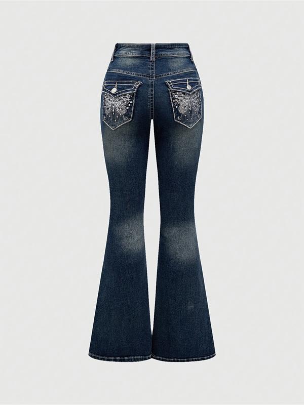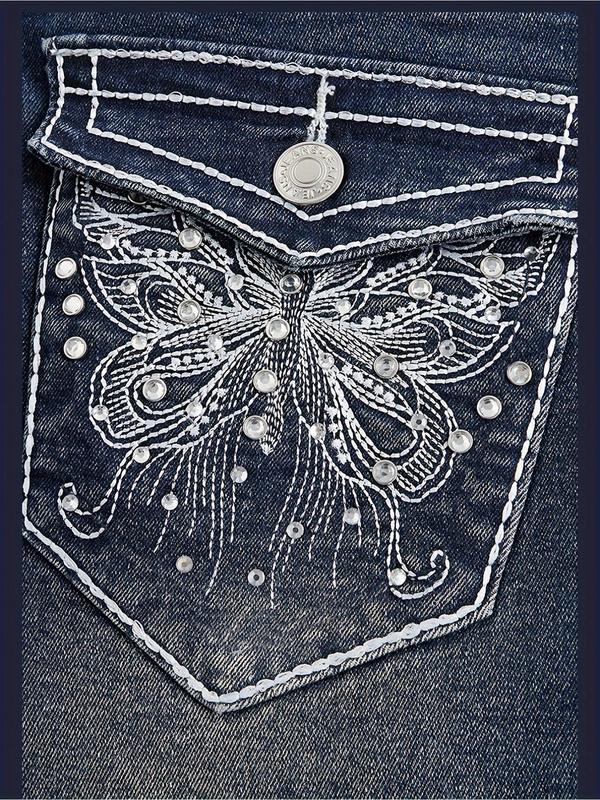 Women's Elegant Fitted Denim Jeans, Hand Embroidered Back Pockets, Rhinestone Detailing, Comfortable Stretchy Washed Look #stretchyjeans #flaredjeans #womensjeans #judybluejeans #jeanshighwaist #adjustablejeans #pacsunlowrisejeans #girlsdenimjeans #tallgirljeans #midsizejeans