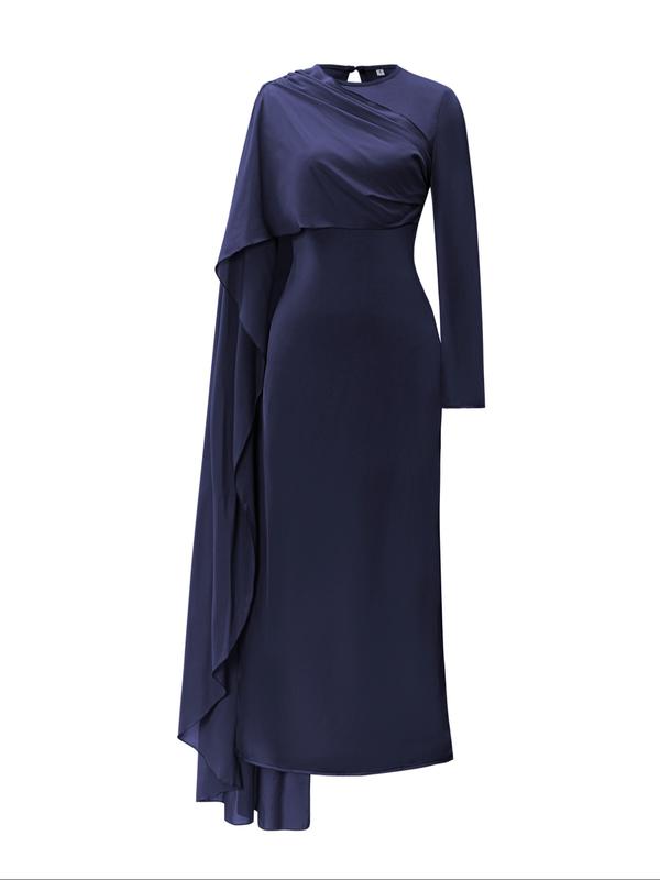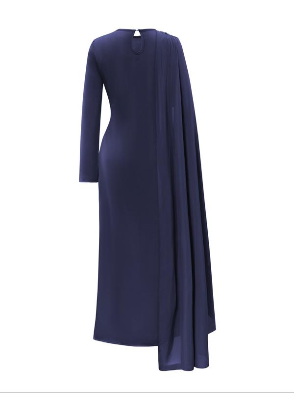 5. Pure Color Elegant Fashion One-Shoulder Cape Long Sleeve Dress, Fitted Style, Plain Pattern, Long Dress Length, Women's Clothing