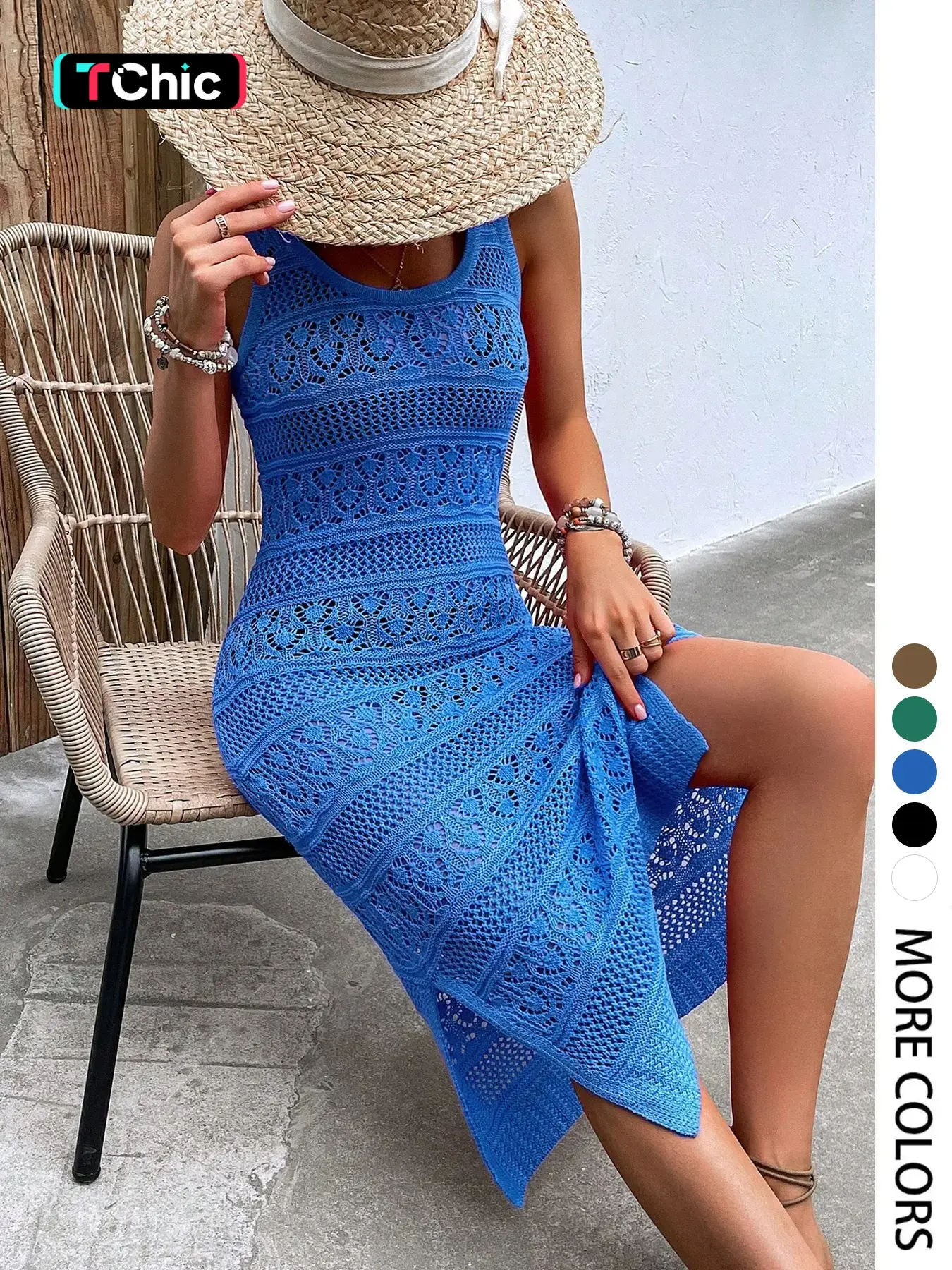 "This long hollow-out dress is perfect for beaches! Unlined design, skin-friendly and comfy fabric!