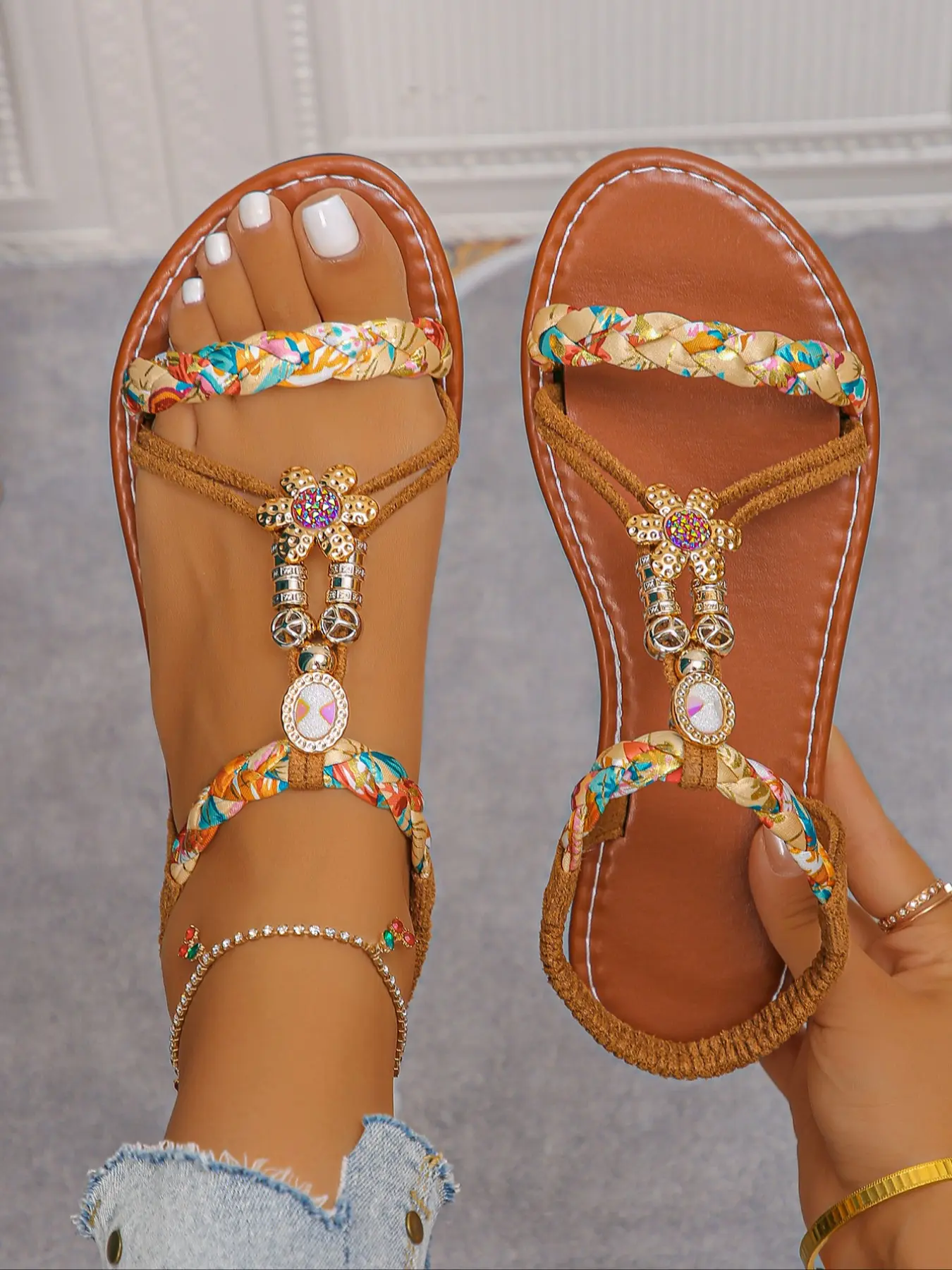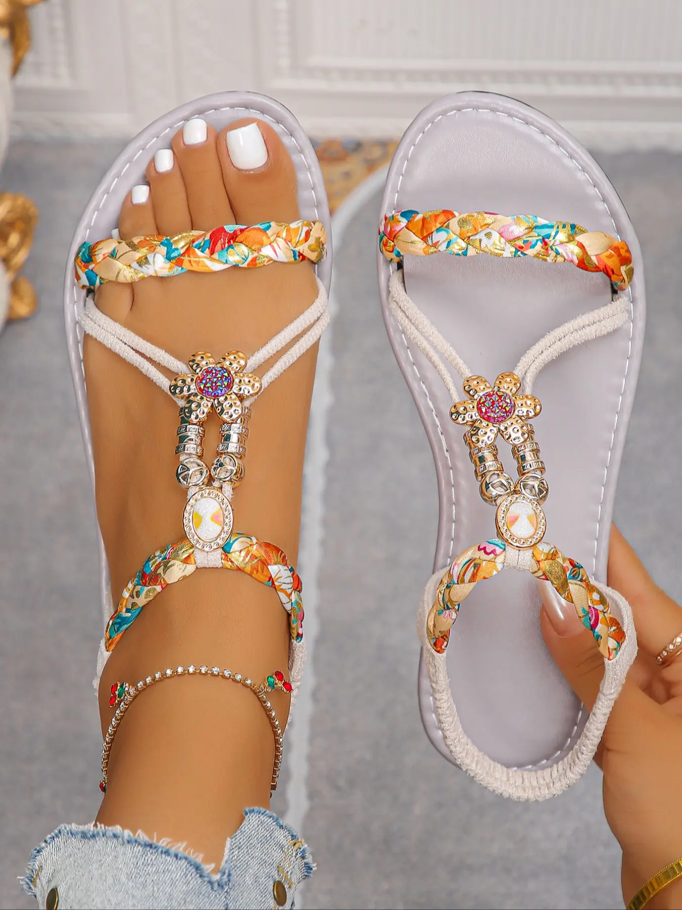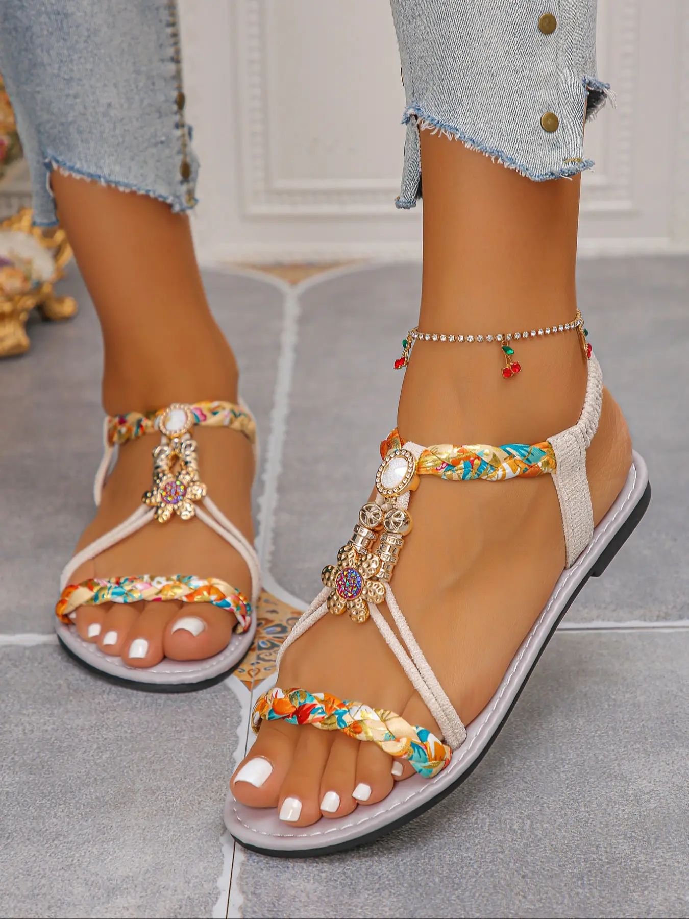 Women's Fashion Ethnic Style Woven Sandals in Suede, Comfortable Ankle Strap with Multi-Colored Patterns for Summer Casual Wear