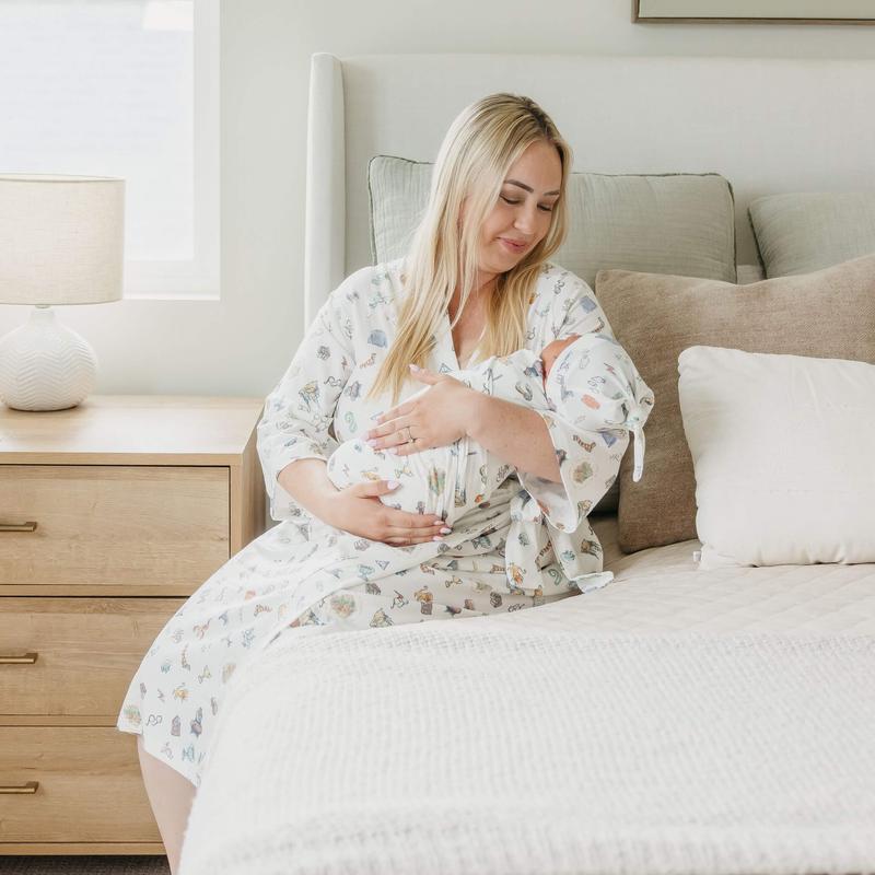 Now mom can enjoy the same buttery soft fabric that has made our swaddles a fan favorite. Featuring flowy, three-quarter sleeves, it closes with an internal tie placed a little higher up to accommodate growing bumps. (Though we know you’ll still love it once baby arrives.) You can even match with little ones for a fun mommy-and-me look.