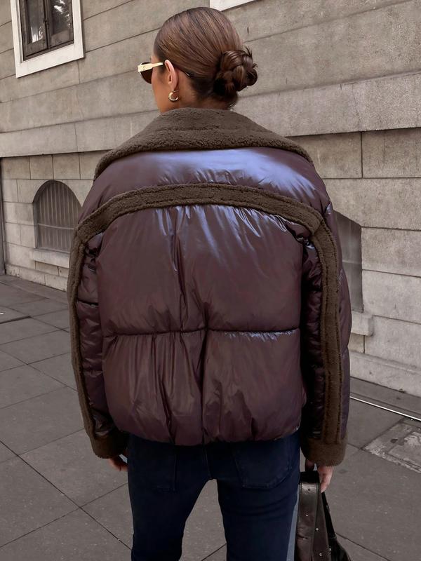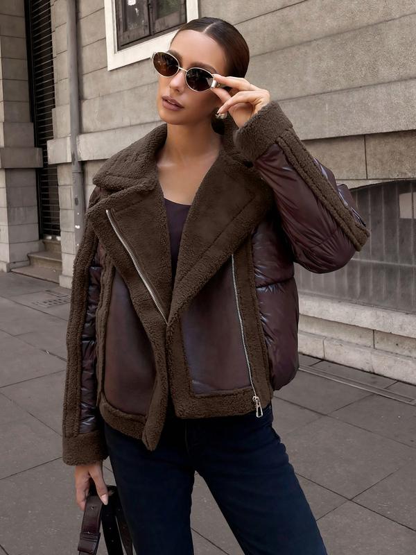 Women's Fall Winter Fur Coat, Stand Collar Warm Top, Motorcycle Style Patchwork Short Jacket, Casual Fitted Long Sleeve Outerwear