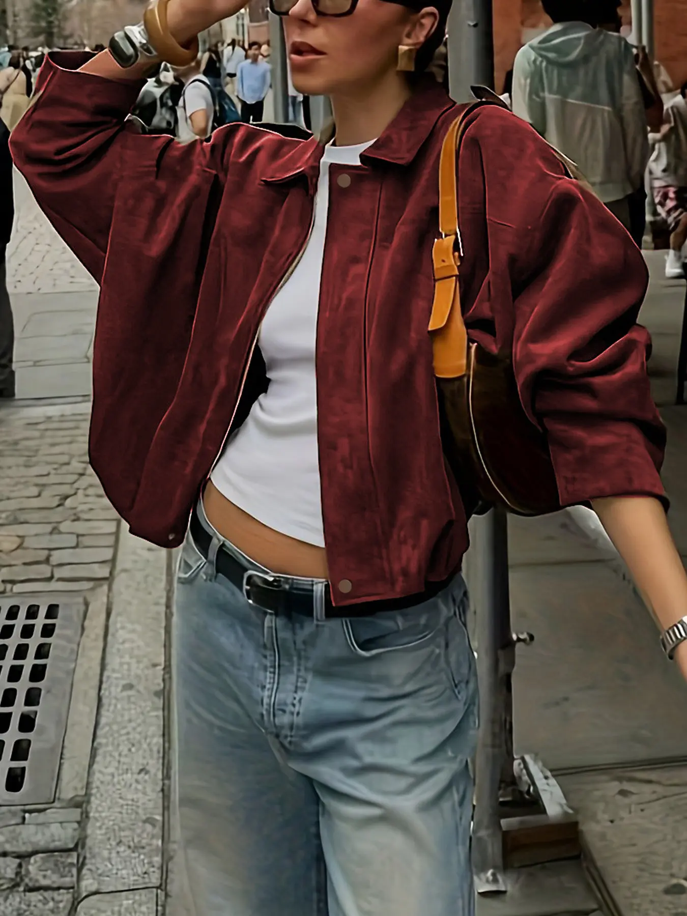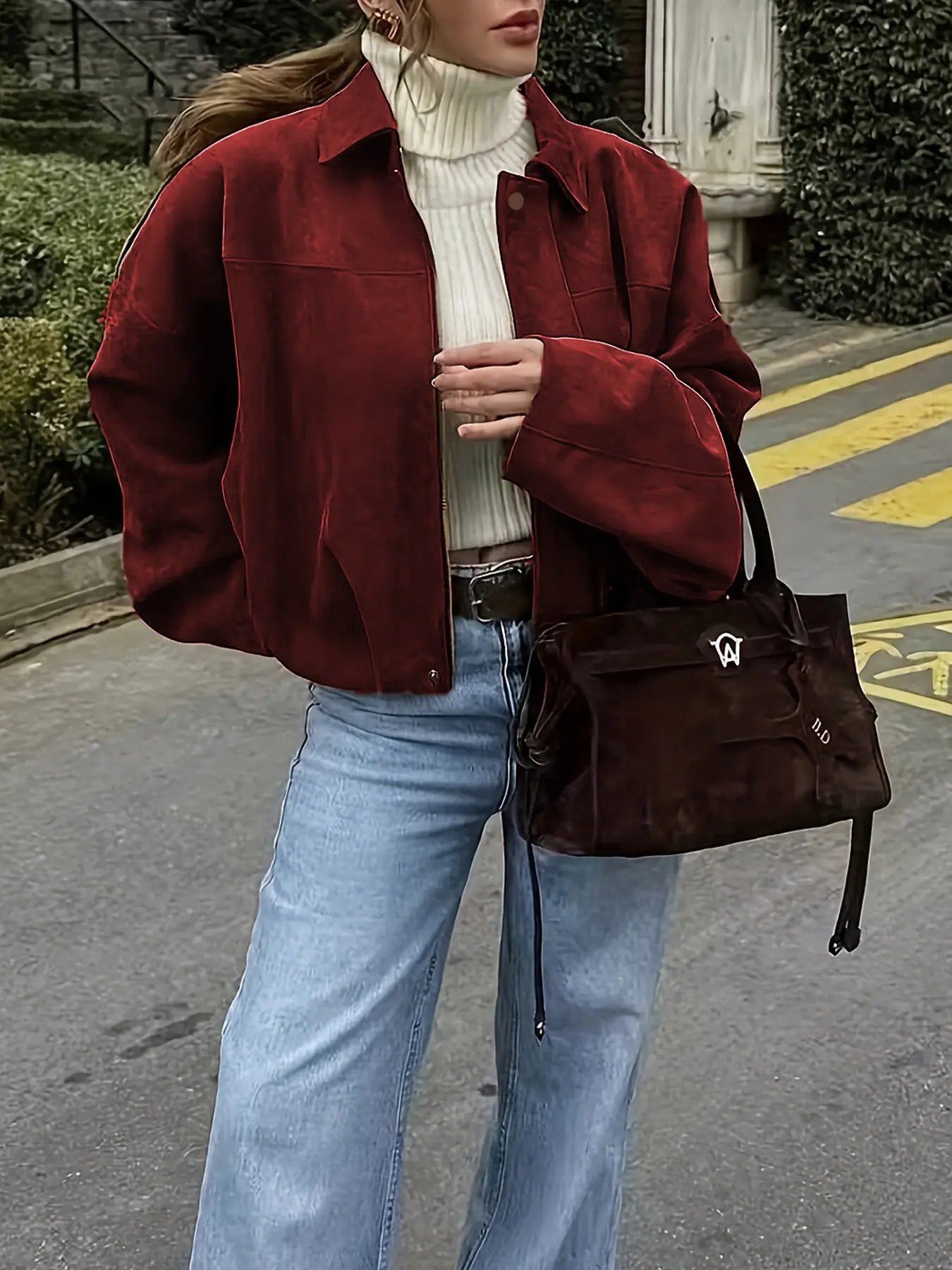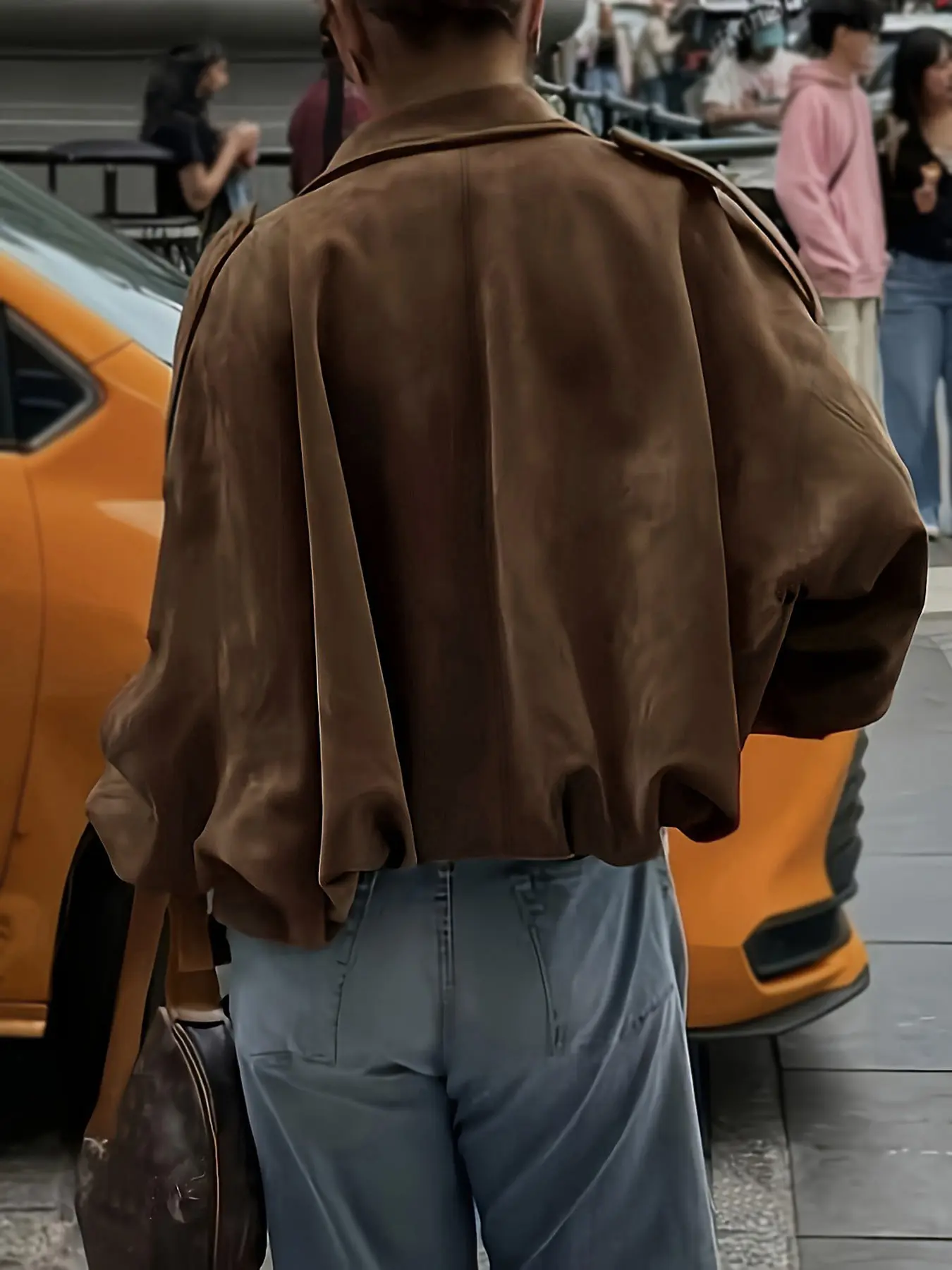 Women's Fall Winter Loose Fitted Suede Jacket, Short Batwing Sleeve Bomber Coat, Plain Leather Look Top, Zipper Neckline, Long Sleeve Vintage Style #TikTokShopBlackFriday #TikTokShopCyberMonday #spotlightfinds #ootd/  #clothing