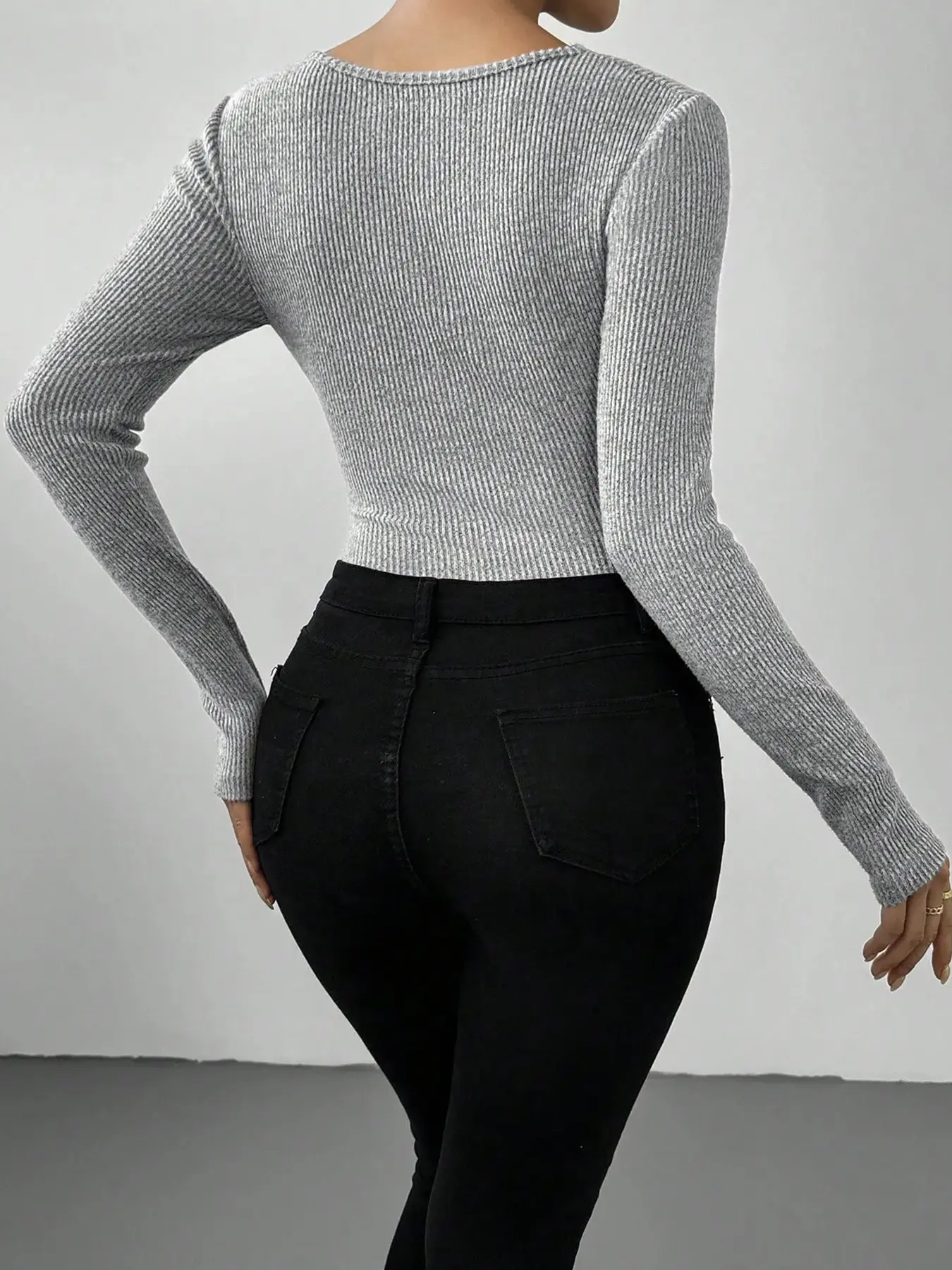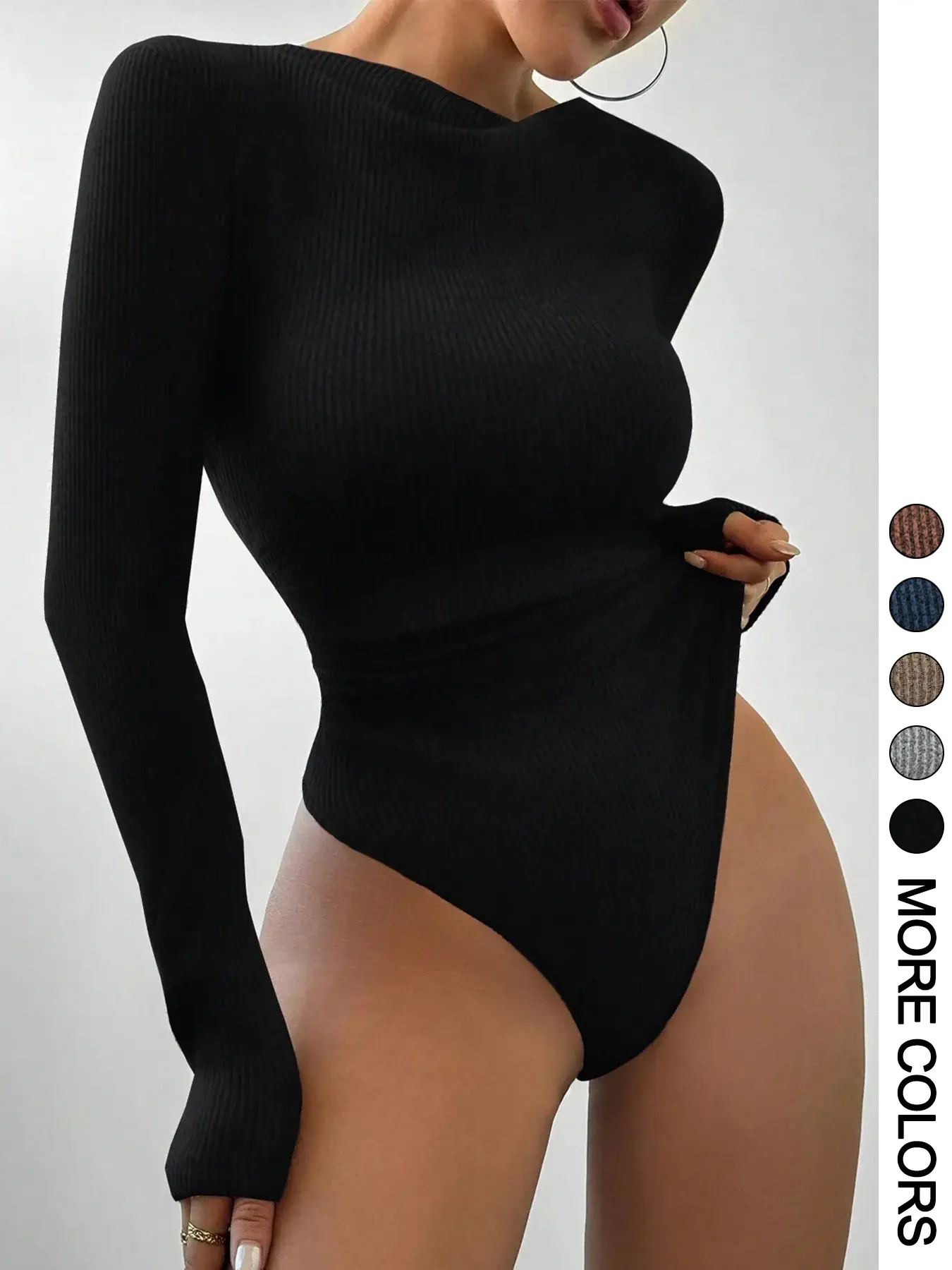 5. Women's Fall Winter Textured Knit Long Sleeve Romper Bodysuit, Sexy Slim-Fitting One-Piece, Plain Pattern, Moderate Fabric Thickness