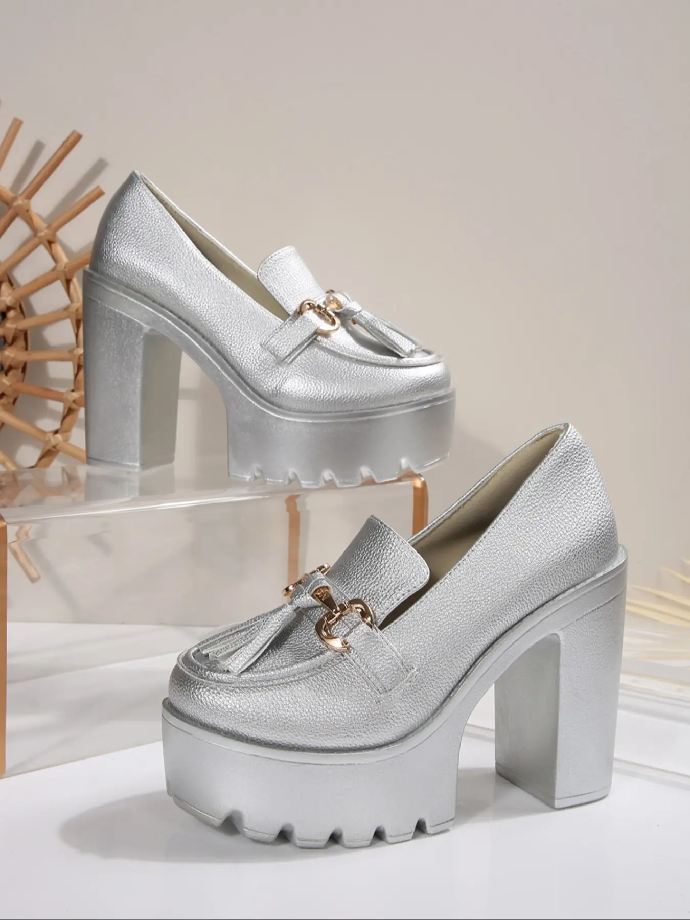 5. Women's Fashion Elegant Classic High Heels, Metal Decor Faux Fur Design, Stage Style Thick Sole Punk Shoes, All Season Wedding Comfortable Wear, Tassel Shoes