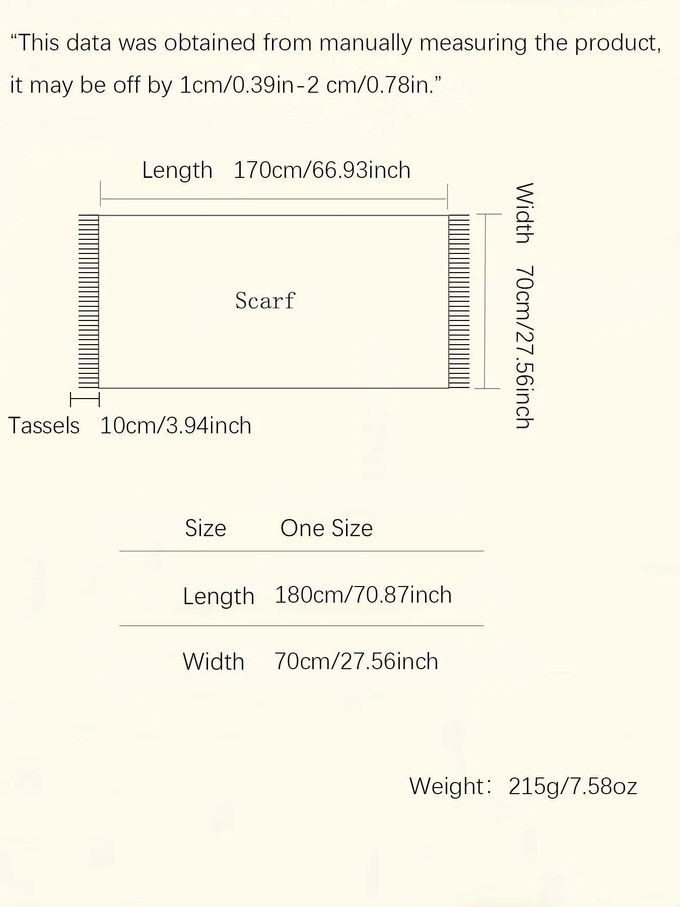 【Fringe Detail】: Showcasing a beautiful fringe, this scarf adds a unique touch to your outfit, enhancing its visual appeal.