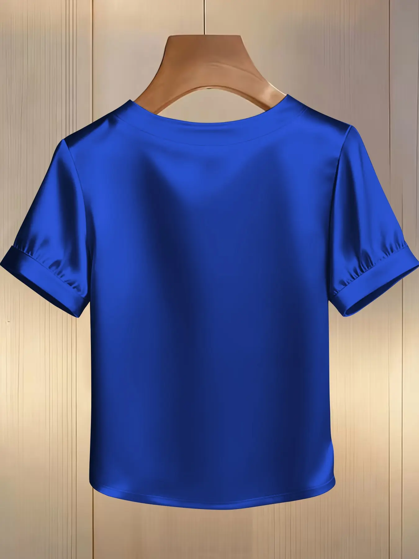 5. Women's Fashion Pearl Round Neck Solid Color Short Sleeve Fitted T-Shirt Top, Casual Summer Wear, Stylish Ladies' Clothing