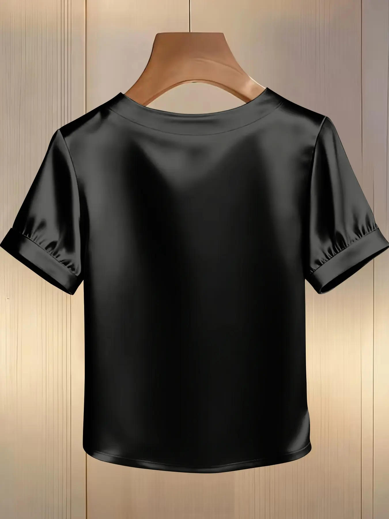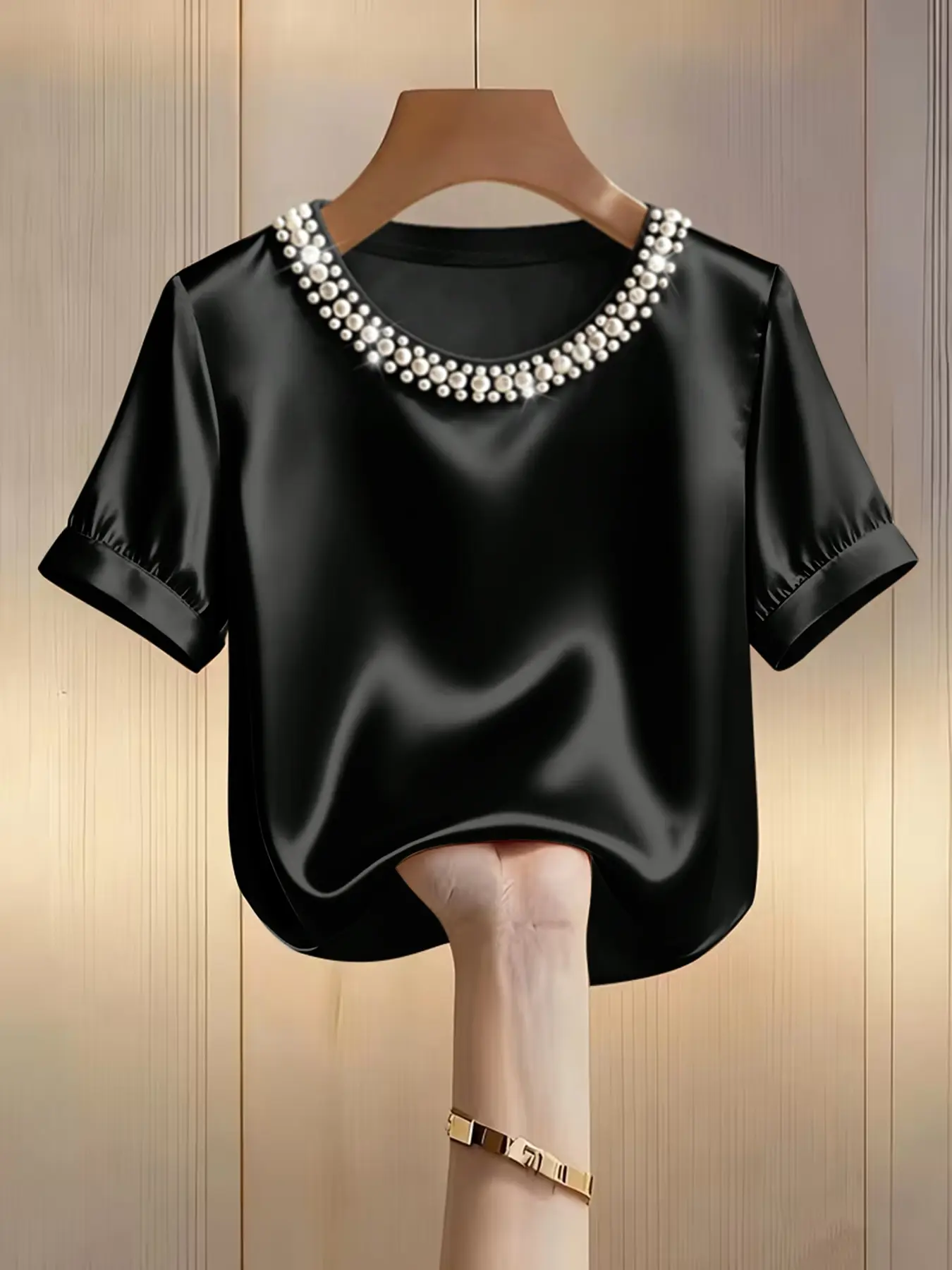 Women's Fashion Pearl Round Neck Solid Color Short Sleeve T-Shirt Top, Casual Summer Wear, Stylish Ladies' Clothing#tiktokshopblackfriday #tiktokshop #women #tiktok #ootd