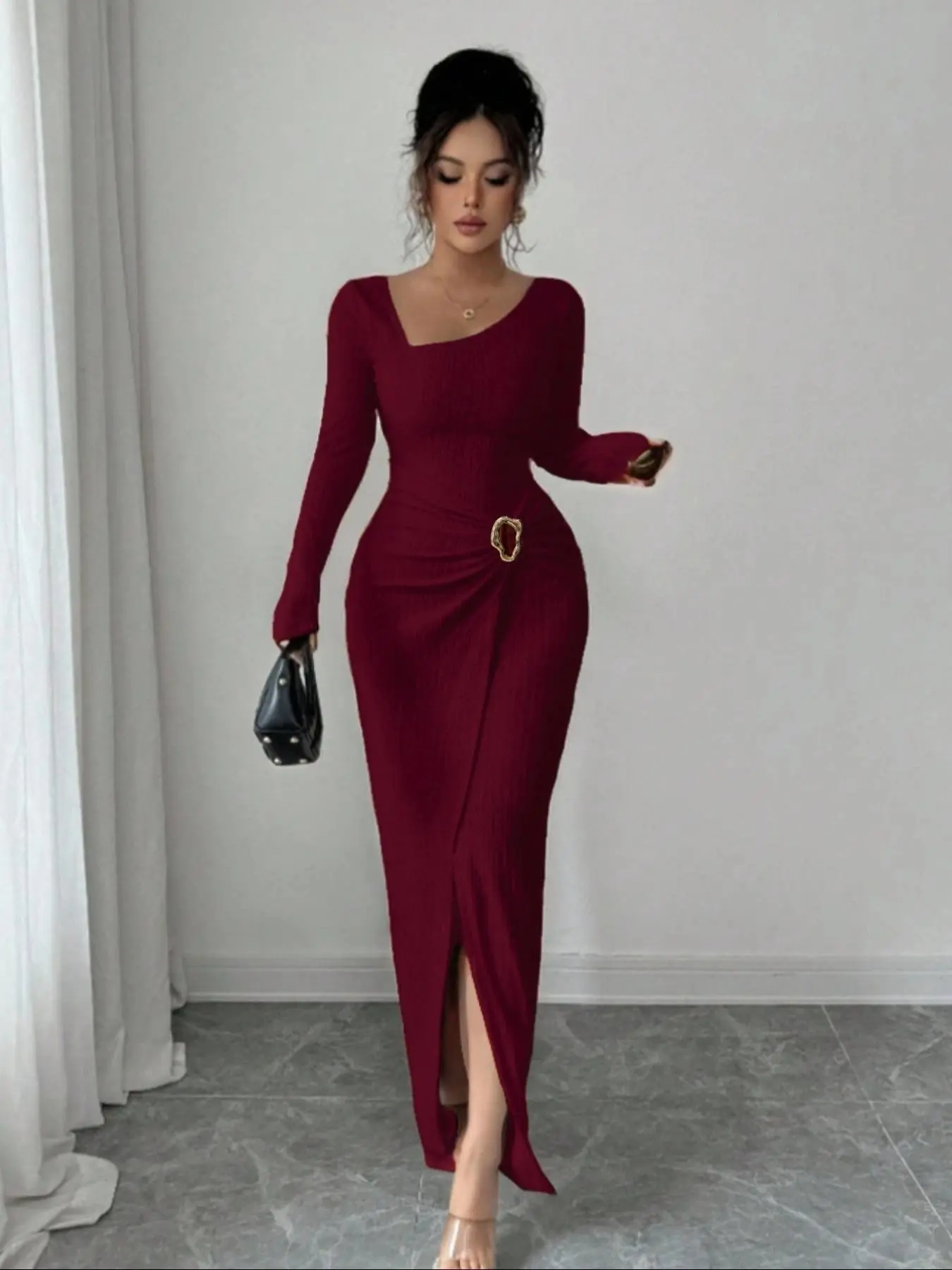 Women's Plain Fashion Twisted Long Dress, Asymmetrical Neck Knit Texture Tight Fit, Elegant Fall Winter Clothing, Twist Split Design @Unique Finds Blouses #dress #tiktokshop #tiktokshopcreatorpicks #longdress #tiktokmademebuyit