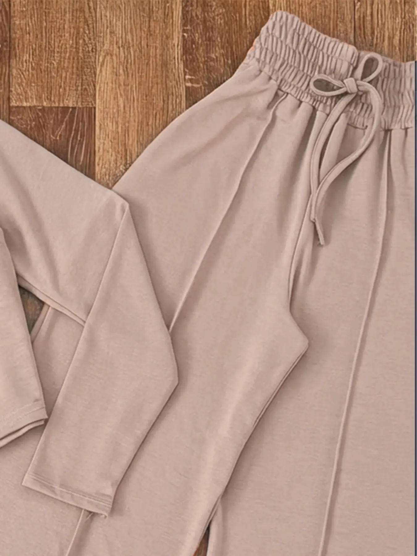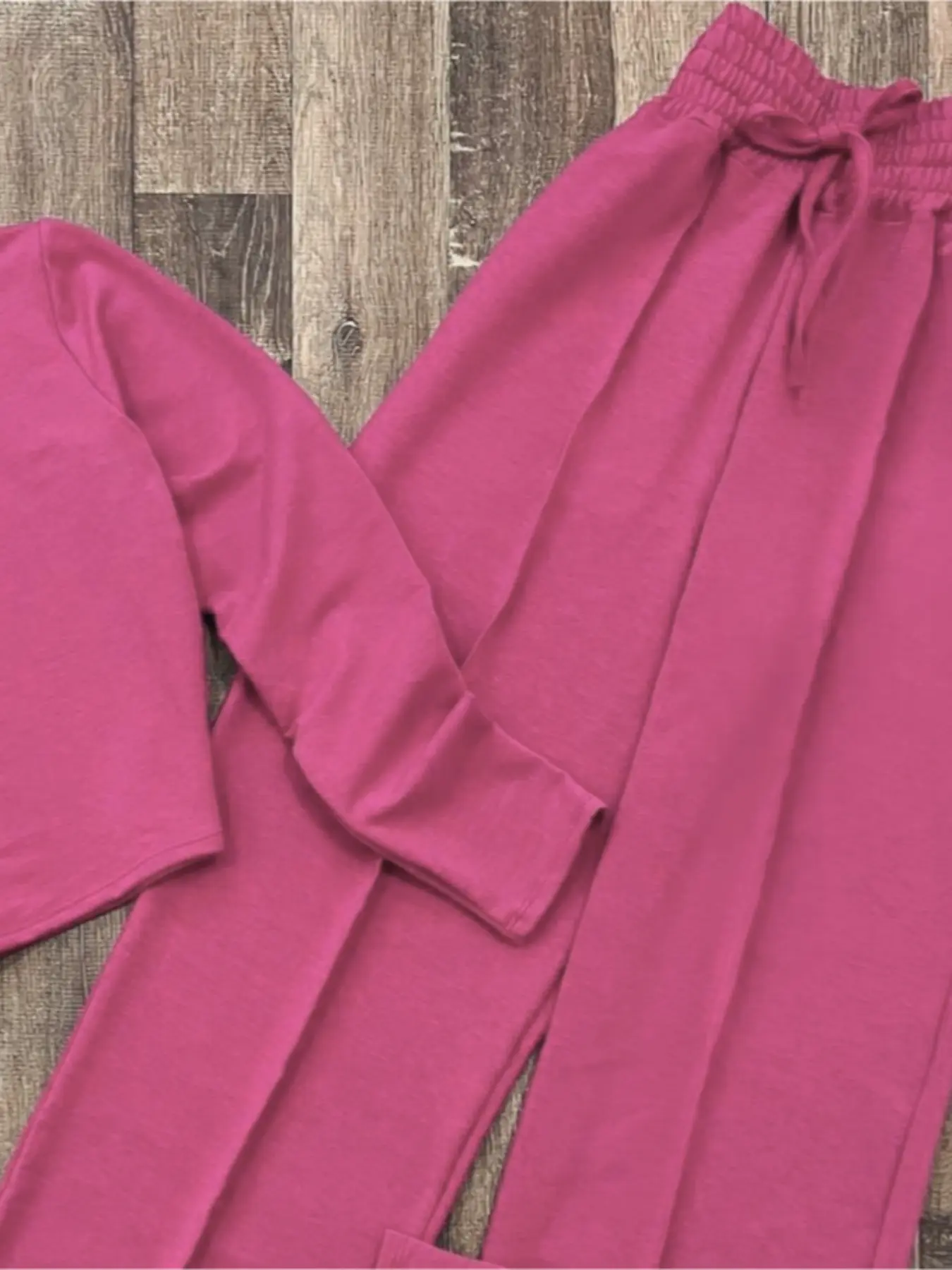 Incluye blusa de manga larga tipo crop y pantalón de tiro alto con resorte y ajuste, ideal para usar todo el día.