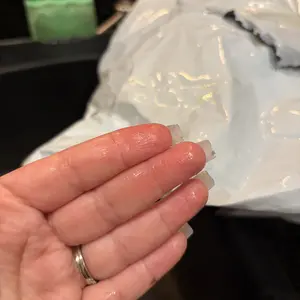 Package was oily and the coat smells terrible. Rancid. I almost threw up.