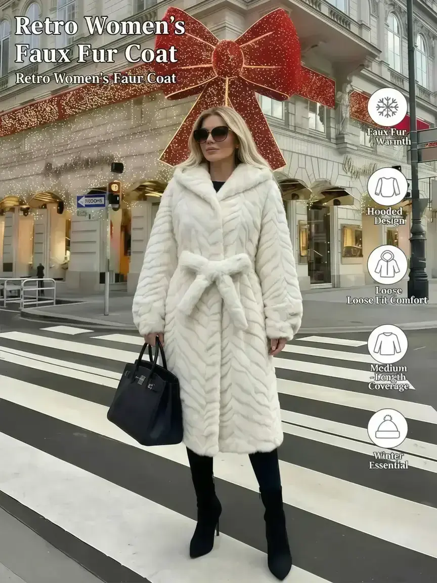Women's Faux Fur Coat, Winter Fashionable Casual Long Sleeve Jacket, Retro Hooded Loose Fit Medium-Length Outerwear for Daily Wear