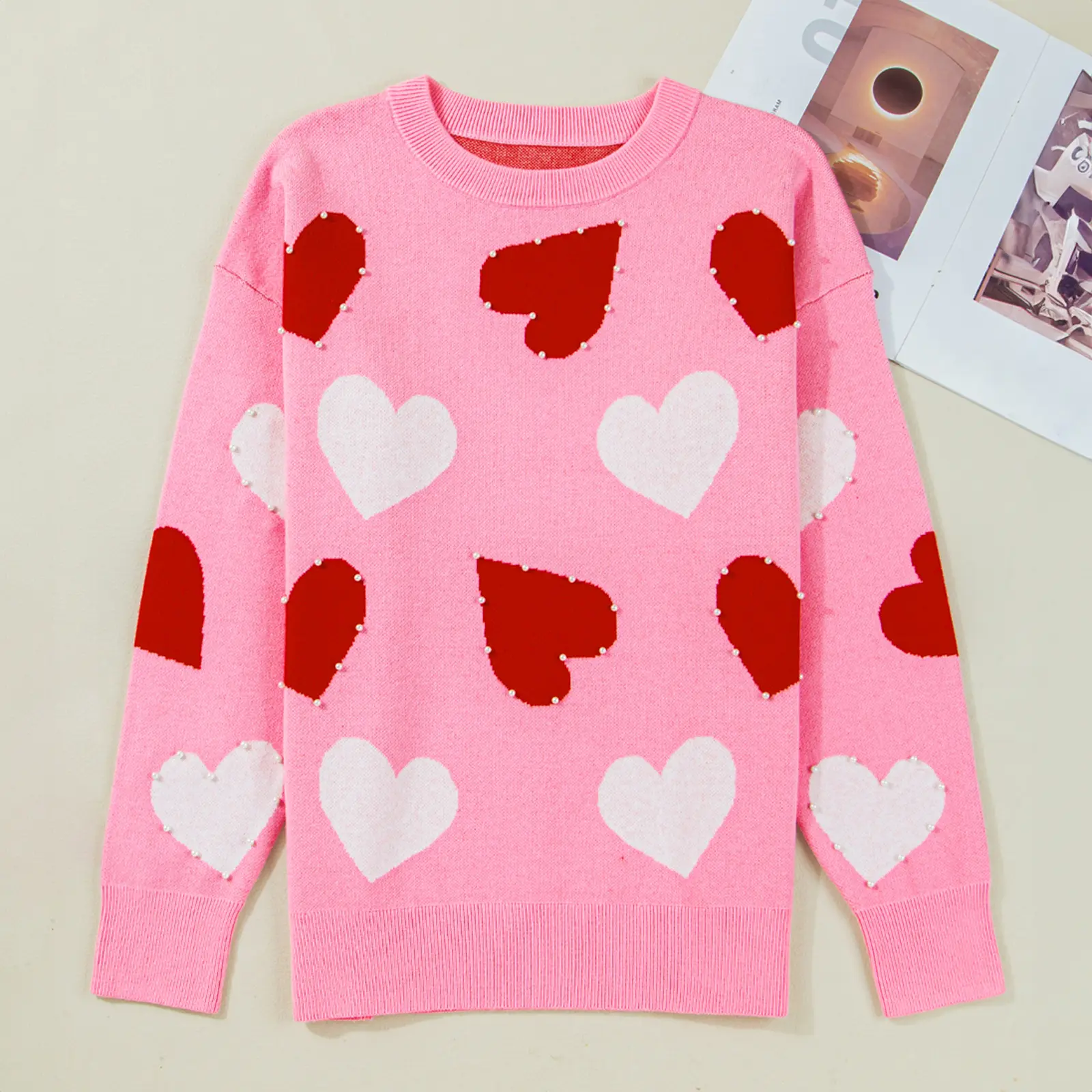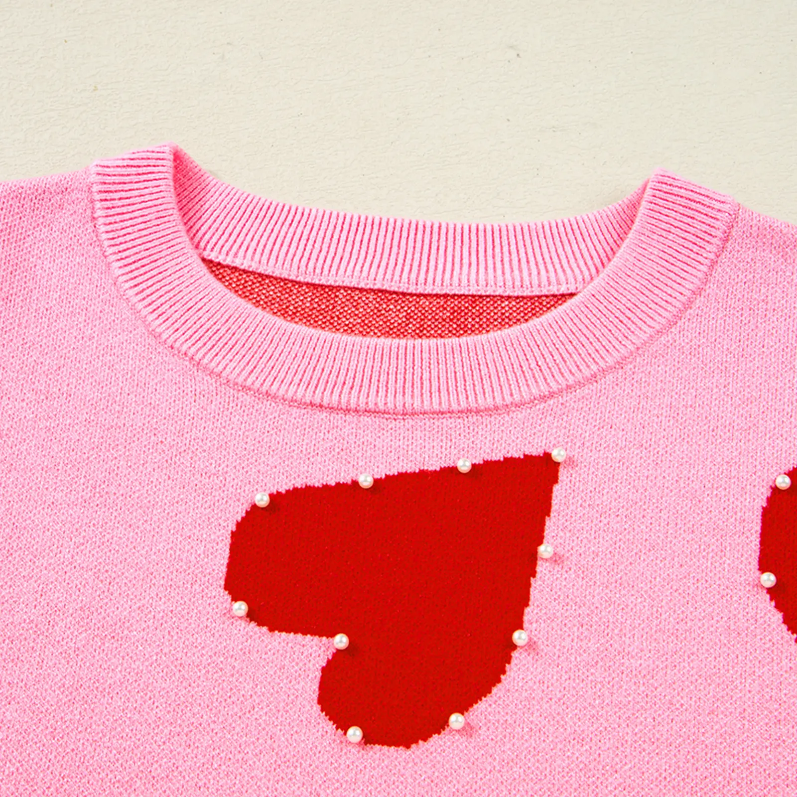Asvivid Women's Faux Pearl Embellished Heart Pattern Valentines Day Sweater Tops