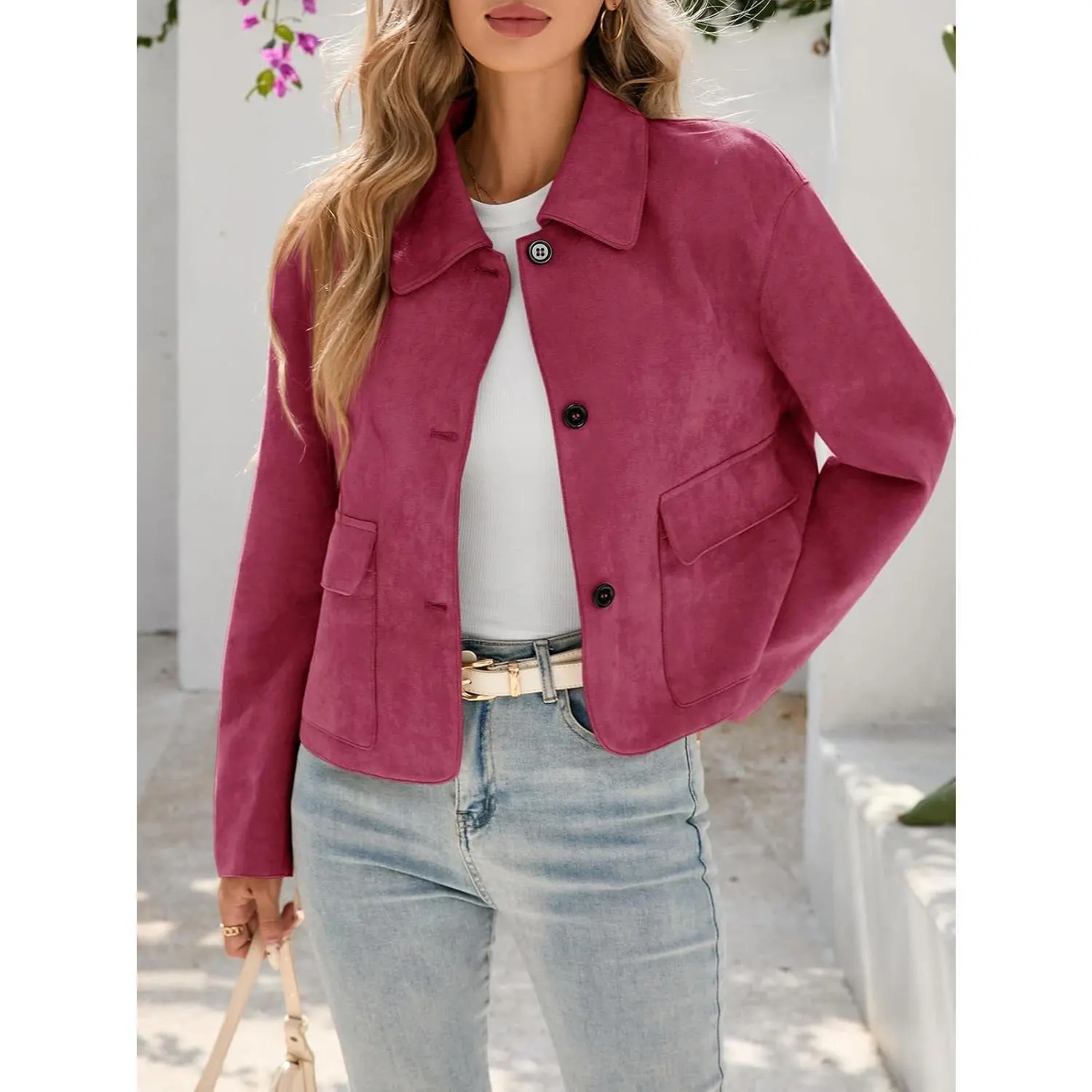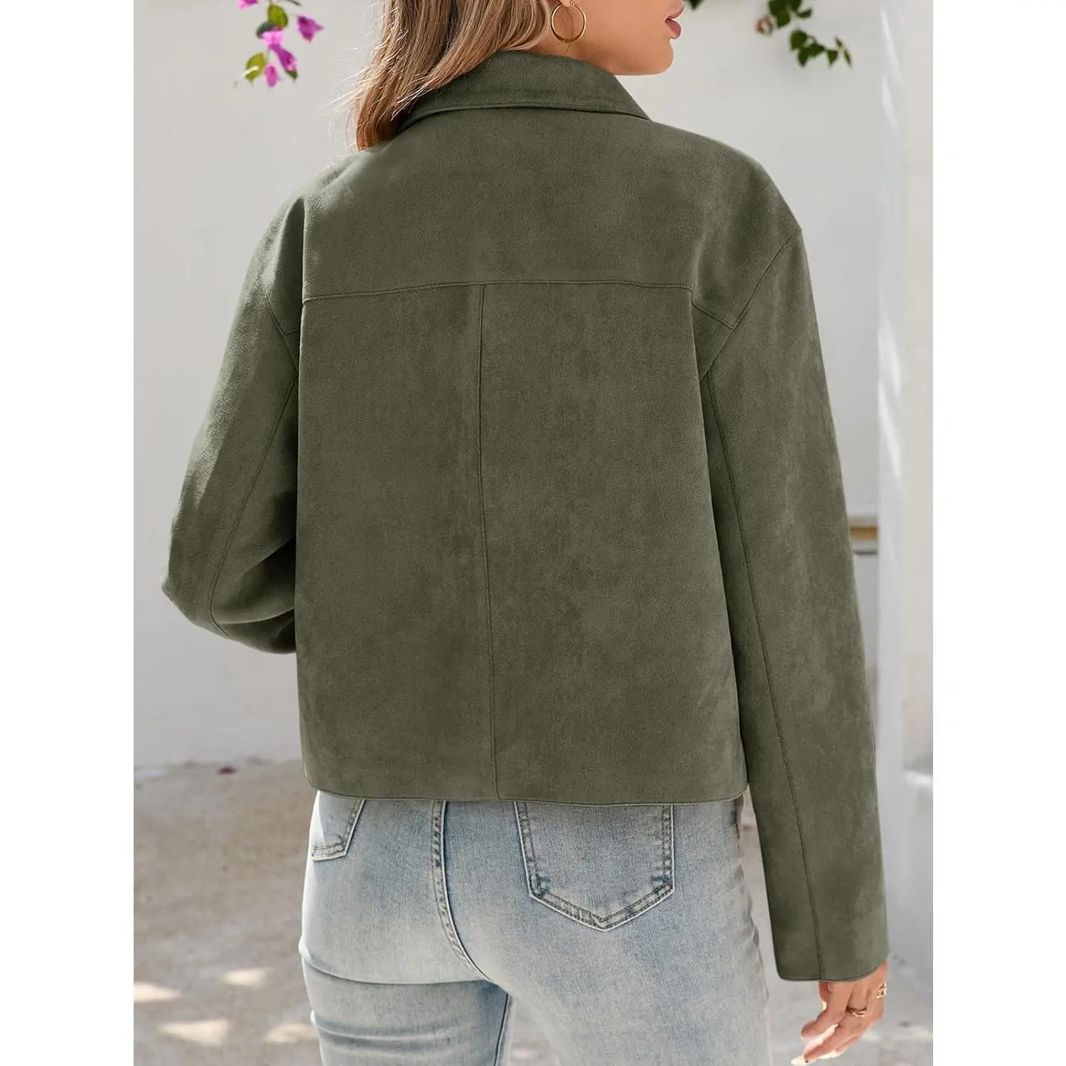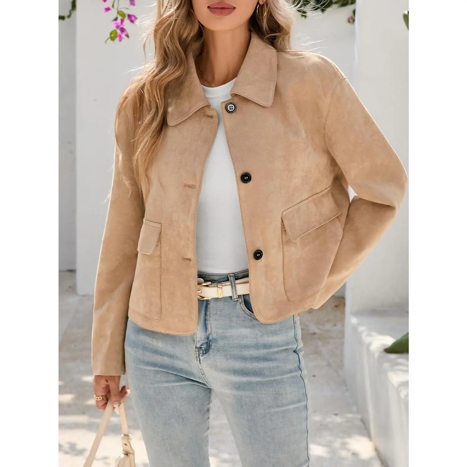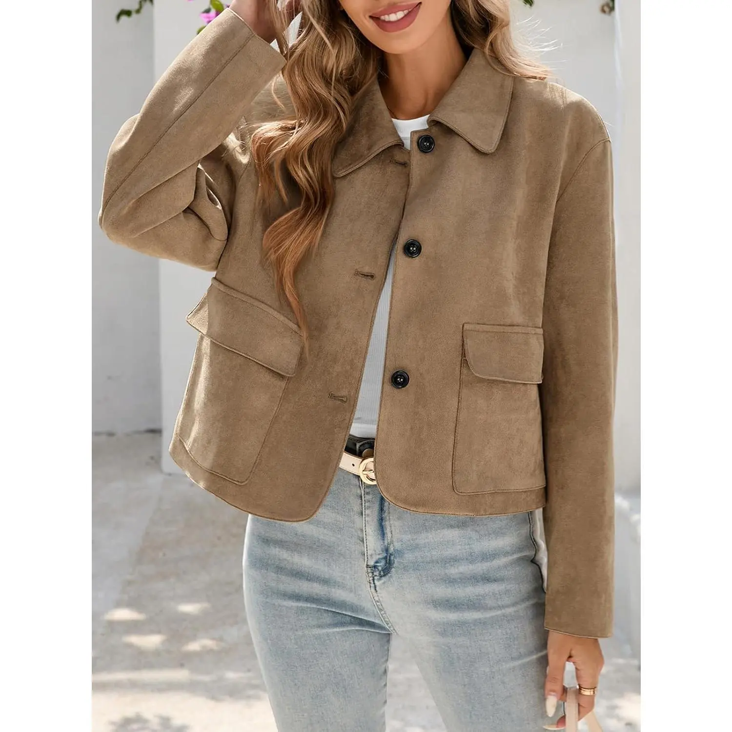 ·Feature: This faux suede jacket women features lapel collared neck, button up closure, cropped short length, convenient front pockets. Stylish and classic, it is definitely your must-have fashion item for fall and spring