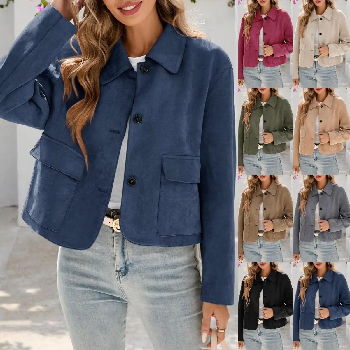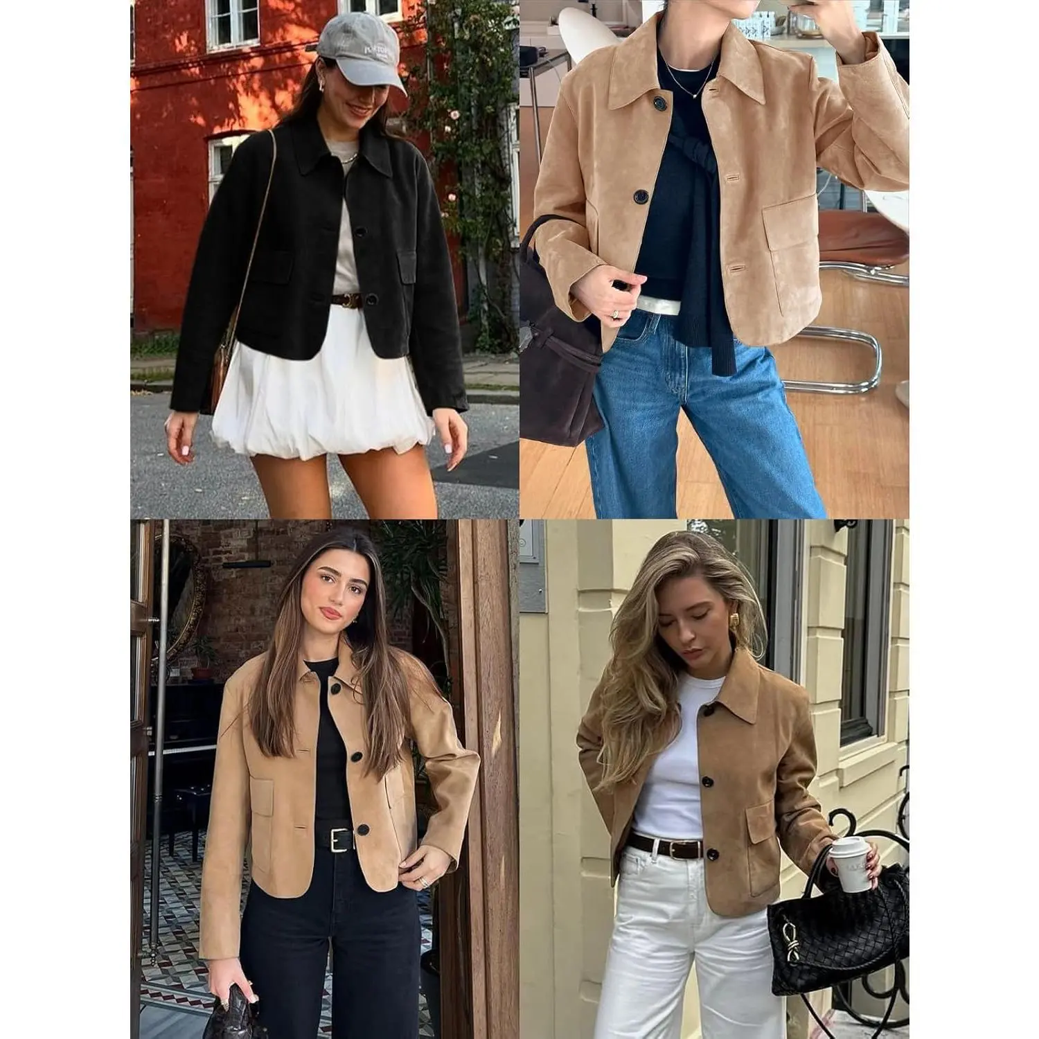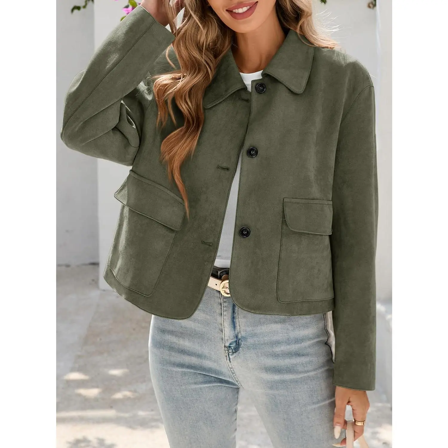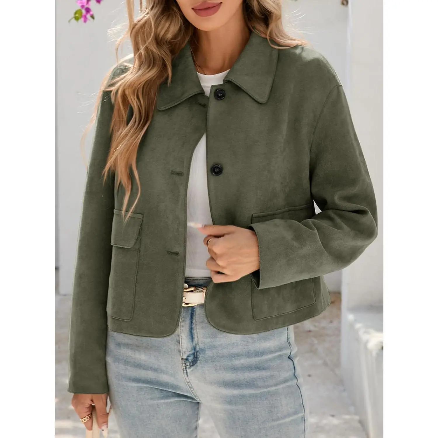 ·Feature: This faux suede jacket women features lapel collared neck, button up closure, cropped short length, convenient front pockets. Stylish and classic, it is definitely your must-have fashion item for fall and spring