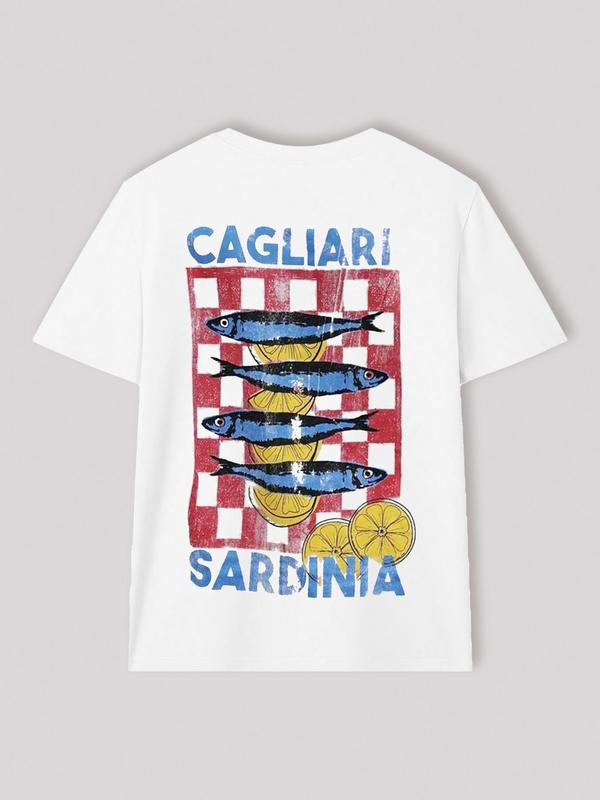 Women's Fish & Lemon Print Round Neck Tee, Casual Letter Graphic Short Sleeve T-shirt for Daily Wear, Ladies Clothes for All Seasons, Top
