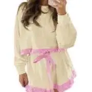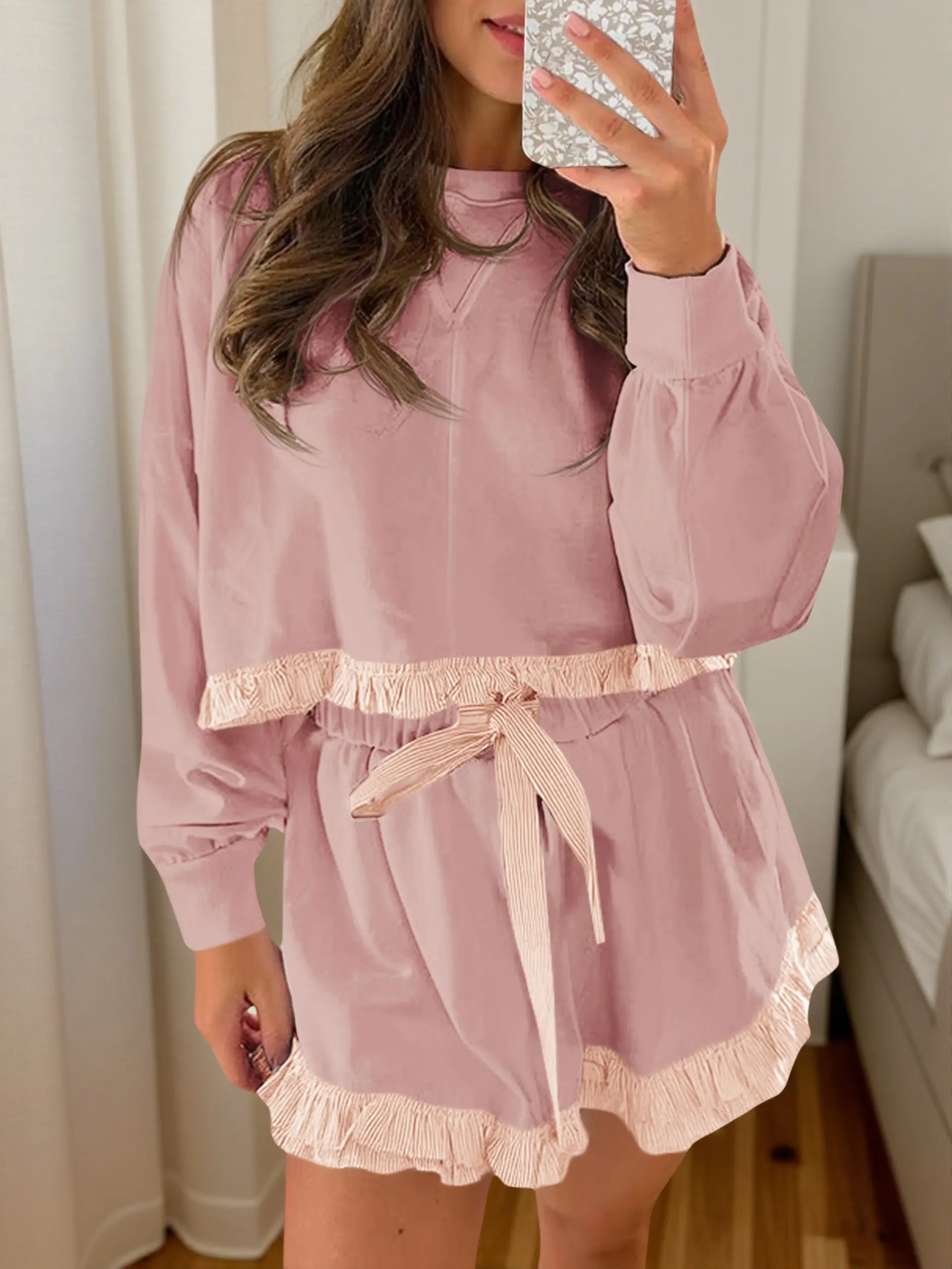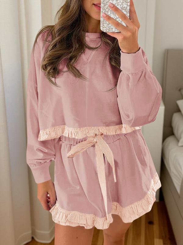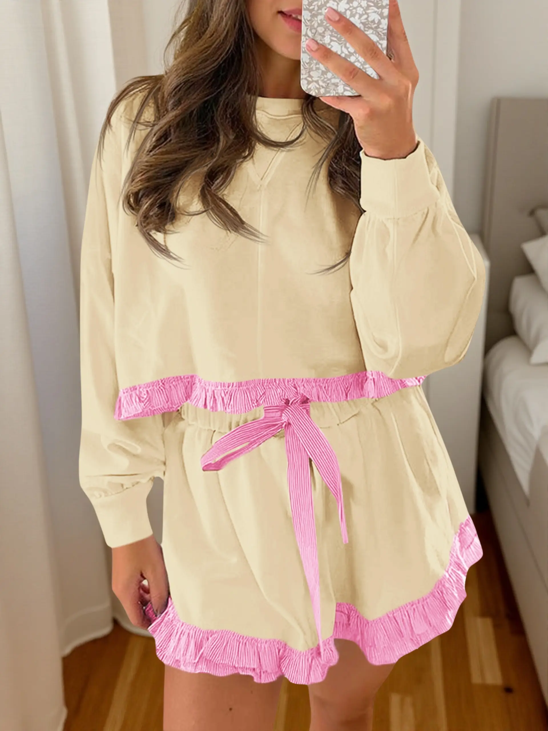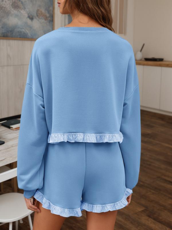 FISOEW COZY SWEATSUIT SET COLOR BLOCK RUFFLE TOP & LOOSE SHORTS