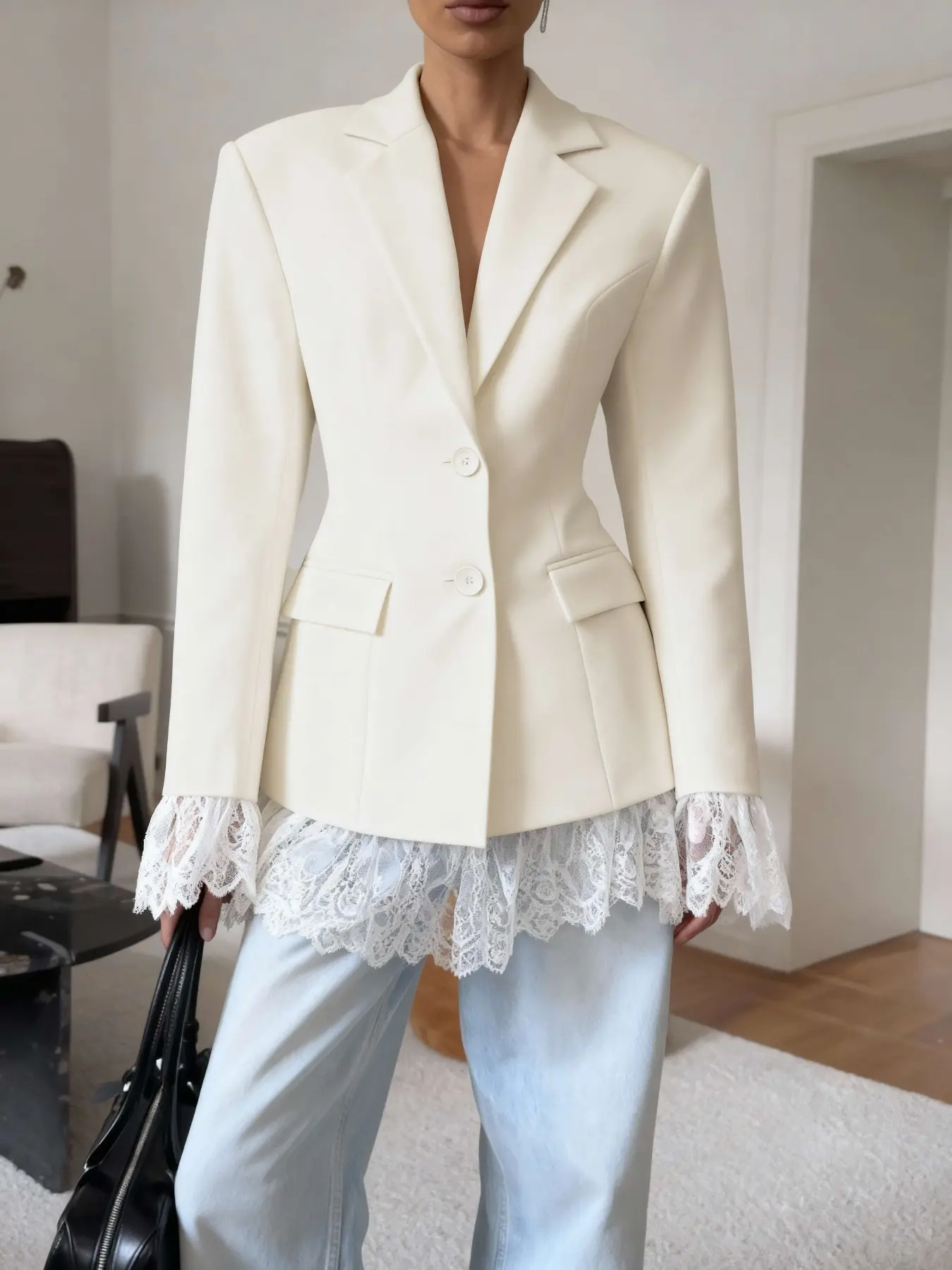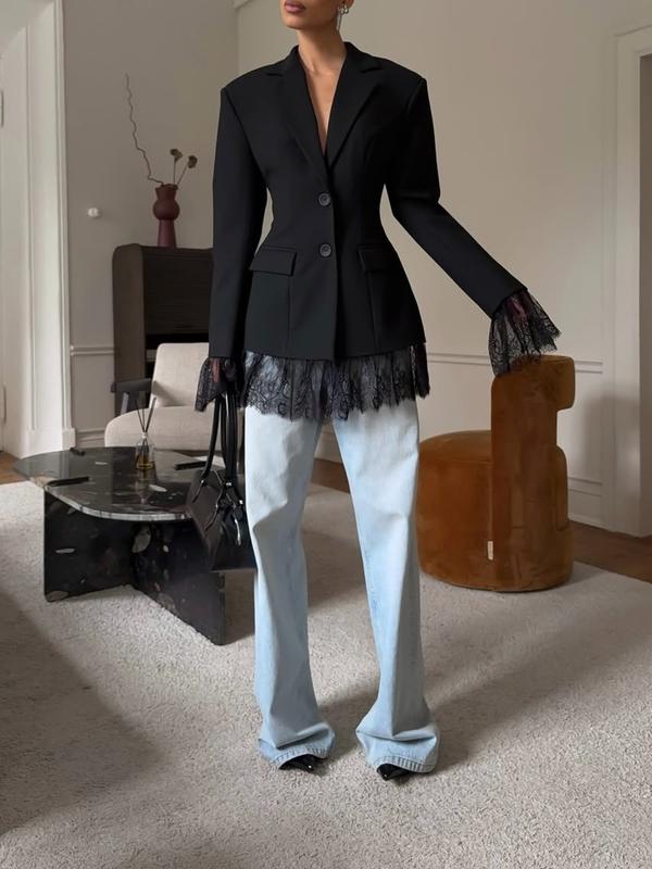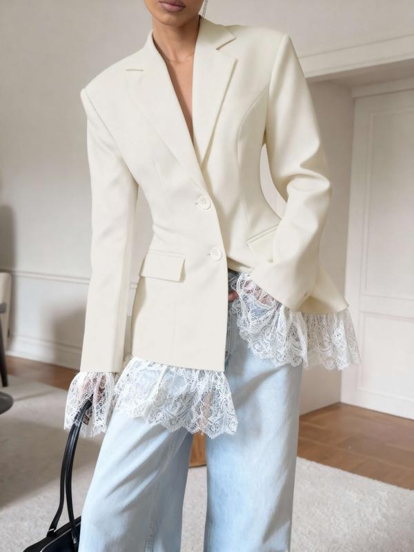 【Lace Contrast】: Features a unique contrast lace insert, adding a distinctive touch to this classic tailored jacket.