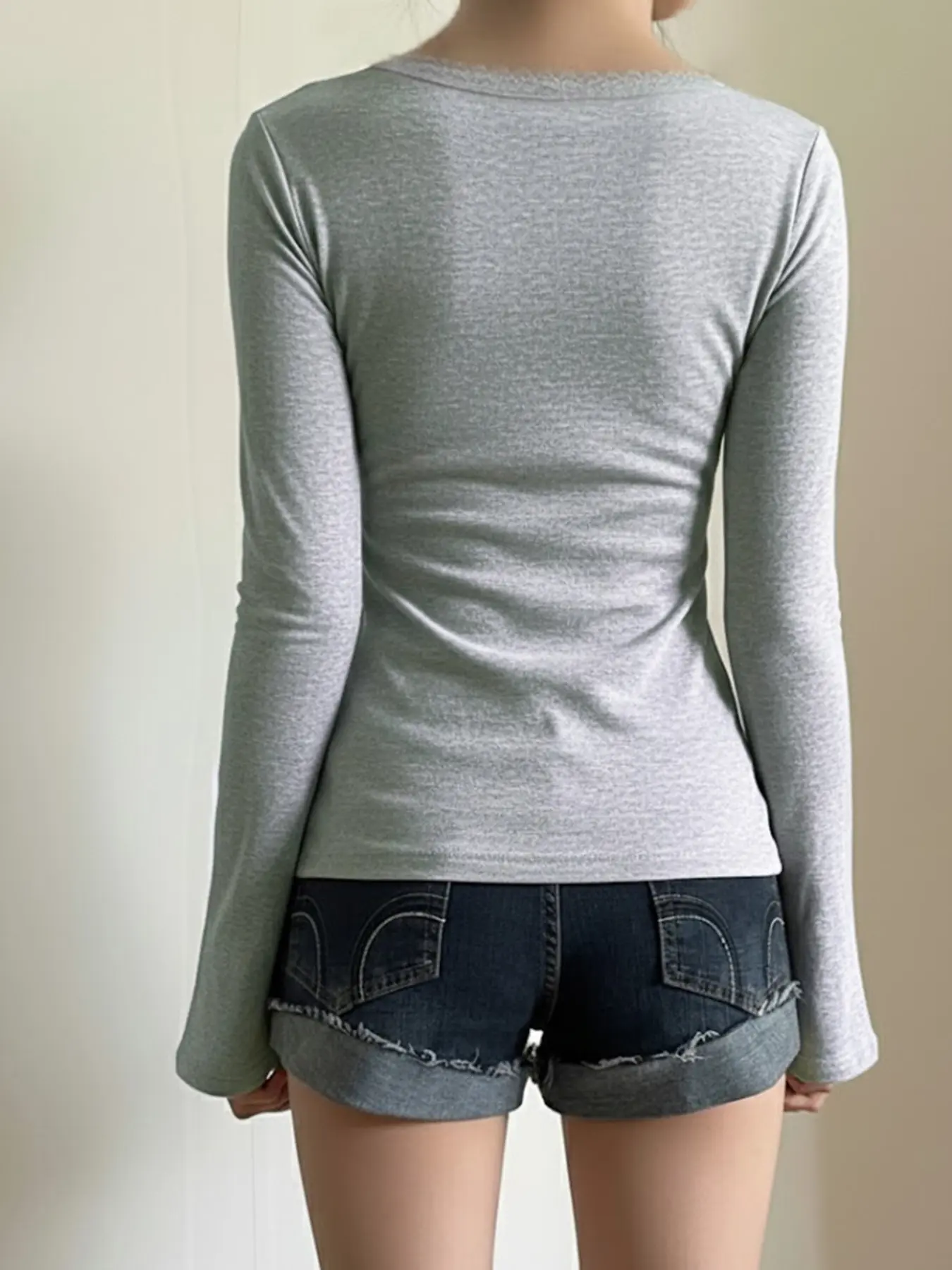 5. Lace Trim V Neck Flare Sleeve A-Line Top, Y2K Casual Solid Color Long Sleeve Basic T-Shirt, Women's Fashion Clothing