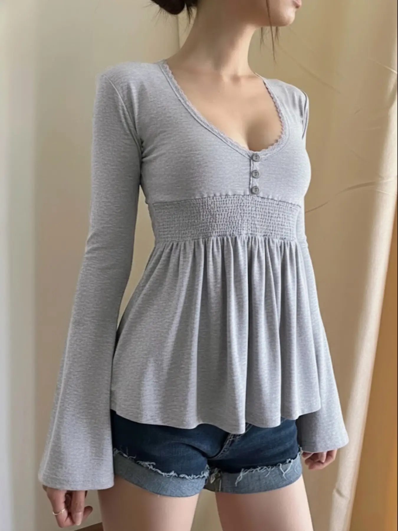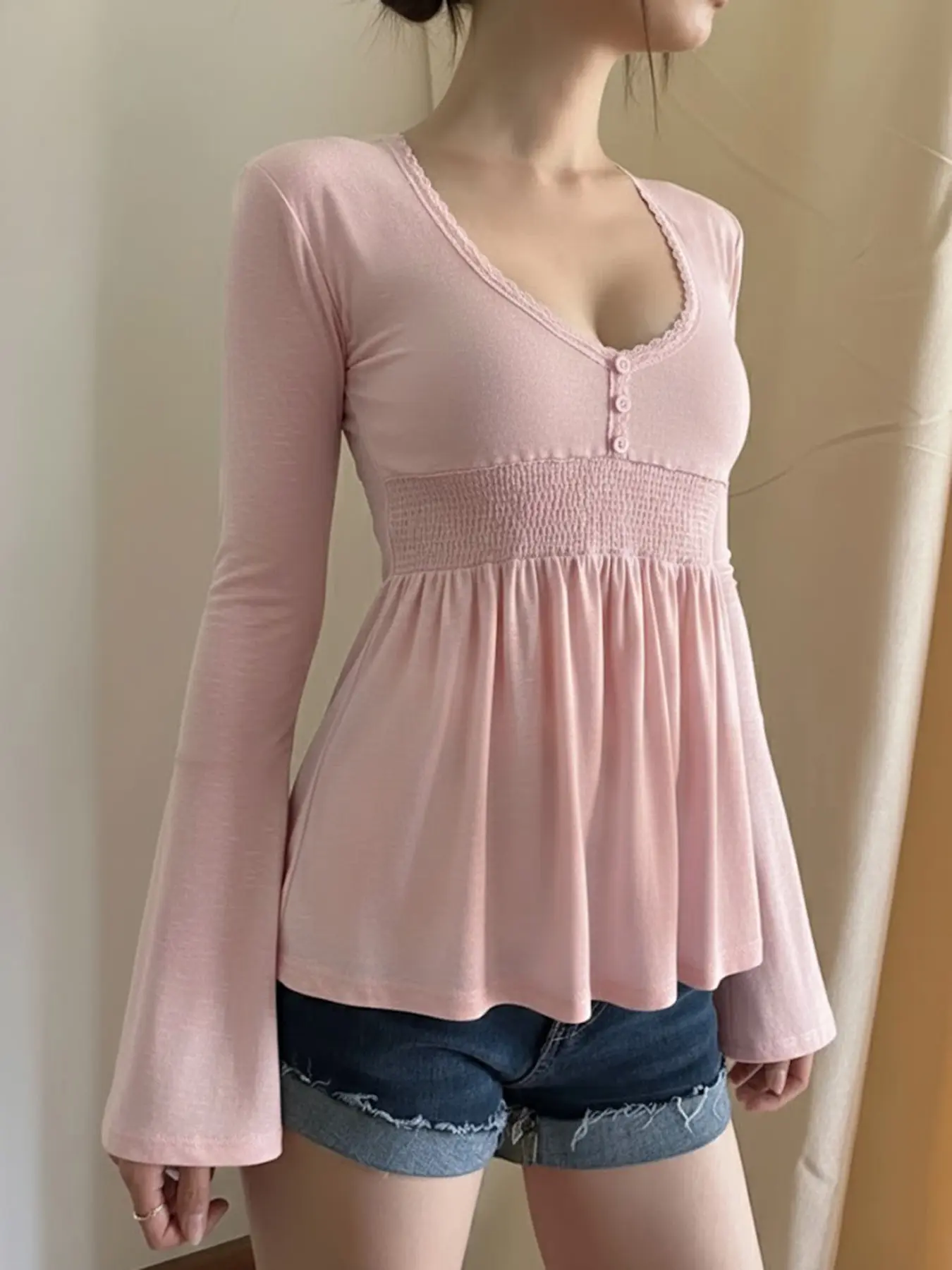 Lace V-neck top 🎀🌷#flaredsleevewaistcinchedstyle #Y2KAlineblouse #slimlongsleevetee#TikTokShopHolidayHaul #spotlightfinds