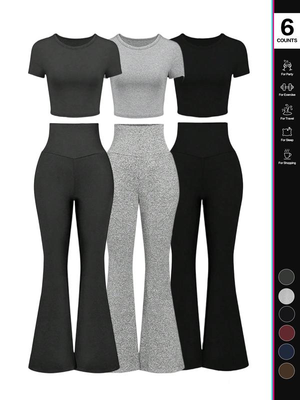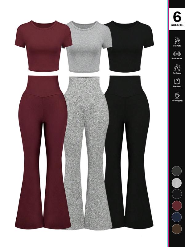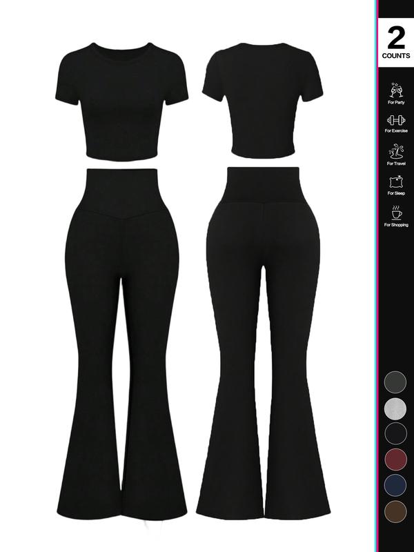 Women's Solid Loungewear Set, Casual Short Sleeve Crop Top & High Waist Flare Leg Pants, Ladies Sleepwear for All Seasons, Pajama Set